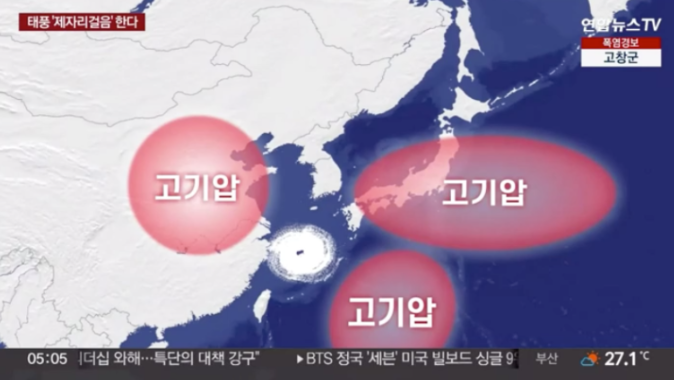 그런데 현재 한국 동쪽에는 '북태평양 고기압'이 서쪽에는 '티벳 고기압'이 위치해 있는 상황이고, 남쪽에서도 고기압이 존재해 태풍이 빠져나가지 못하고 한반도로 쭉 느린 속도로 이동하게 되는 것이다.