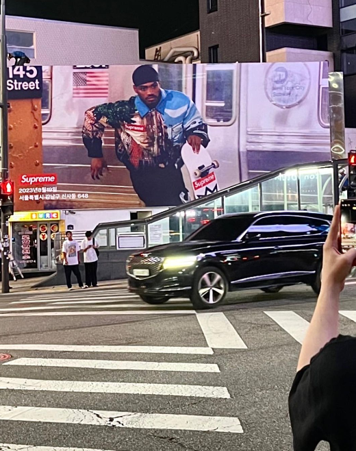 사진은 이태원에 걸린 슈프림 도산 스토어의 옥외 광고 사진이다. 슈프림 스케이트보드를 들고 맨해튼 145번가 지하철역을 달리는 타이숀 존스의 모습이 담겼다.