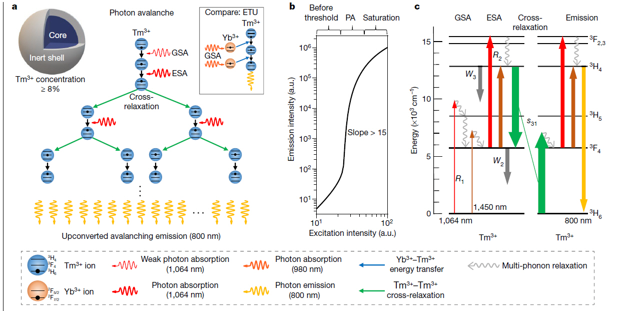'Photon avalanche(PA ; 광사태)'란 빛과 눈사태를 결합한 말로서, 눈이 점점 내려올수록 규모가 커지는 눈사태와 같이 적은 빛을 넣었을 때 그 빛이 증폭해 에너지가 더욱 커지는 현상을 말한다.