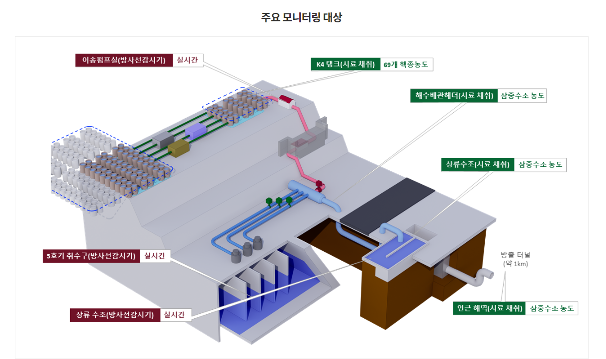 - 한 달 동안은 매일 원전 주변 바다를 분석하며 모니터링 실시를 하며 국제원자력기구인 IAEA는 삼중수소 등을 포함한 나머지 물질이 정상 범위라고 밝힘. 이어 일본 정부의 수산청도 원전 근처 바다의 생선들의 삼중수소 농도 검사 정상 범위라고 덧붙임.
