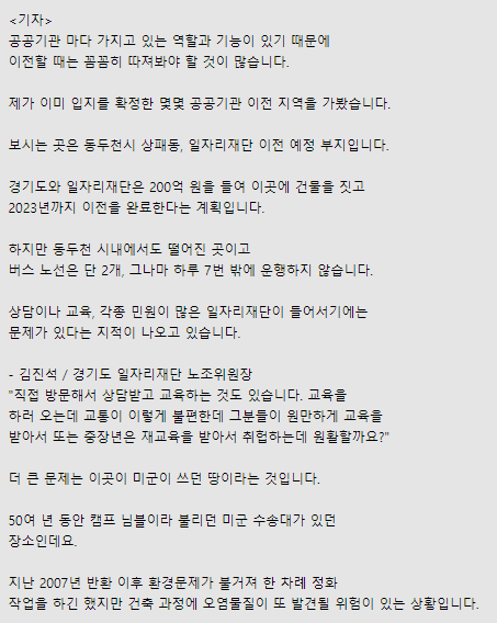 특별한 희생을 감수해야 하는 사람들은 더 있는데요. 바로 직장을 따라 단체로 이주해야 하는 직원들입니다. 어떤 문제들이 있는지 경기도 공공기관 노조 총연맹 김종우 의장 연결해 잠깐 얘기
