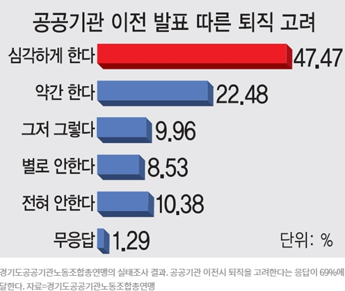 3차례에 걸친 경기도 공공기관 이전 발표로 인한 내부 진통이 가라앉질 않고 있다.이전 대상 공공기관 종사자들을 대상으로 실시한 설문조사 결과 80%가 넘는 응답자들이 기관 이전으로 인한 불