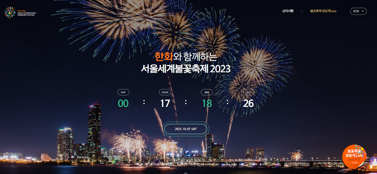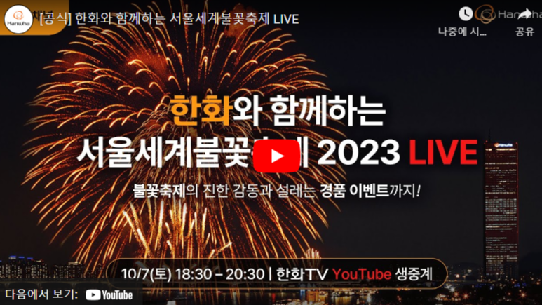 현장이 아니더라도 멀리 계신 분들도 불꽃축제를 관람할 수 있도록 한화에서 유튜브로 생중계를 해준다. 불꽃놀이 행사가 본격적으로 시작되는 18:30부터 20:30까지 한화TV 유튜브로 관람하면 된다.