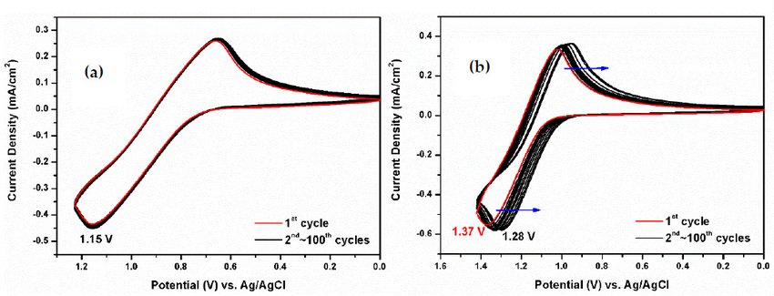 또한, 전압을 달리 줬을 때 사이클 모양이 바뀌기도 한다. 원리는 일정한 전압을 줬을 때 환원 반응이 일어나면서 positive 전류를 발생시키고, 환원 반응이 일어날 수 있을 만큼 일어나 전류의 양이 감소한다. 이때 positive 포텐셜이 강해지면서 산화 전류가 흐르는 방식이다.