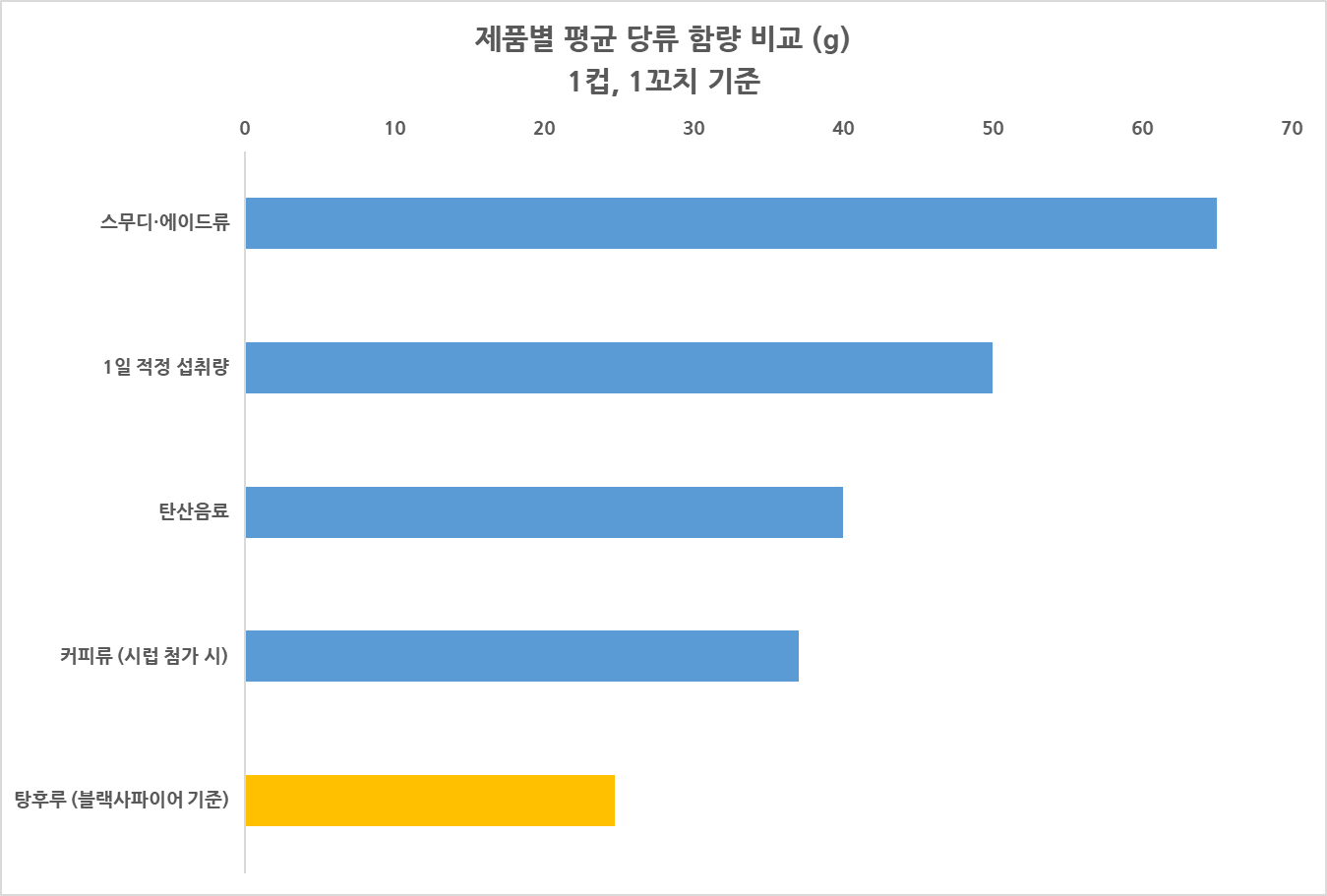 ✅ 그러나 2022년 한국소비자원이 프랜차이즈 커피 음료 전문점 29개 업체를 대상으로 조사한 결과, 과일이나 초콜릿류를 첨가한 스무디와 에이드류 등 29개 제품 1개당 평균 당류는 65g이었다.
