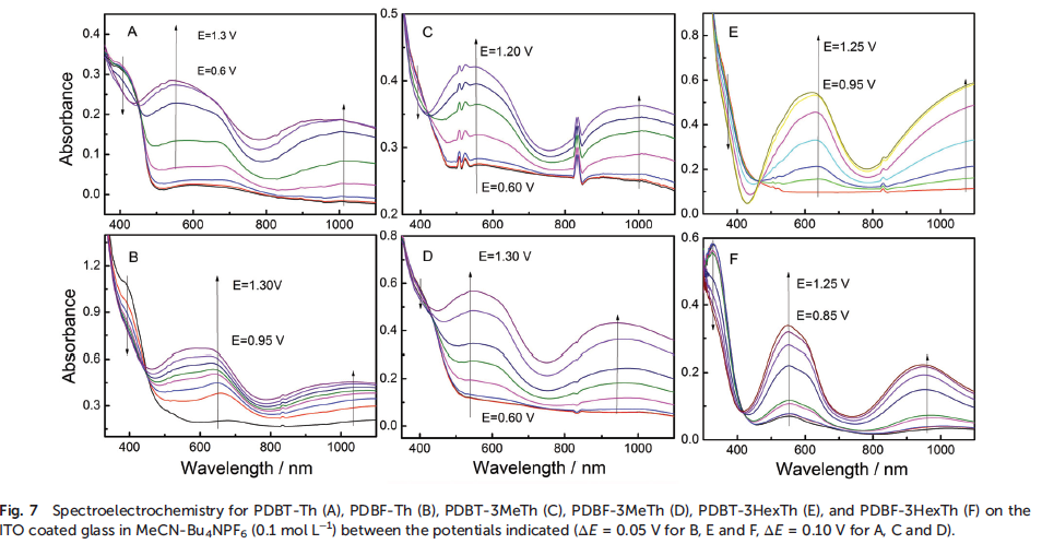 논문에 있는 자료를 보니, 샘플에 특정 전압을 인가하고, 파장에 따라 산화환원 반응을 살펴보는 것으로 보인다. 아래 사진은 6개의 샘플과 각각 전압을 달리 줘서 흡수율을 나타낸 자료이다.
