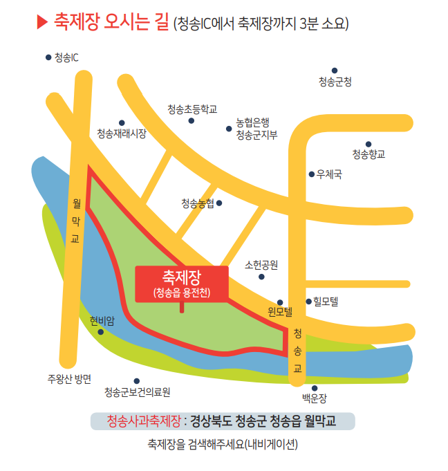 ✅ 일정 : 2023년 11월 01일(수) ~ 05일(일) *5일 간 진행하며, 온라인에서도 23년 10월 06일부터 축제가 끝나는 11월 5일까지 다음 포털에서 '청송사과축제'를 검색해 프로그램 참여가 가능