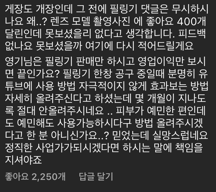 ✅ 필링기 공구 중일 때 게장 때처럼 열렬한 CS + 유튜브에 자극적이지 않게 효과 보는 법을 올리겠다고 했으나, N개월 째 올리지 않음