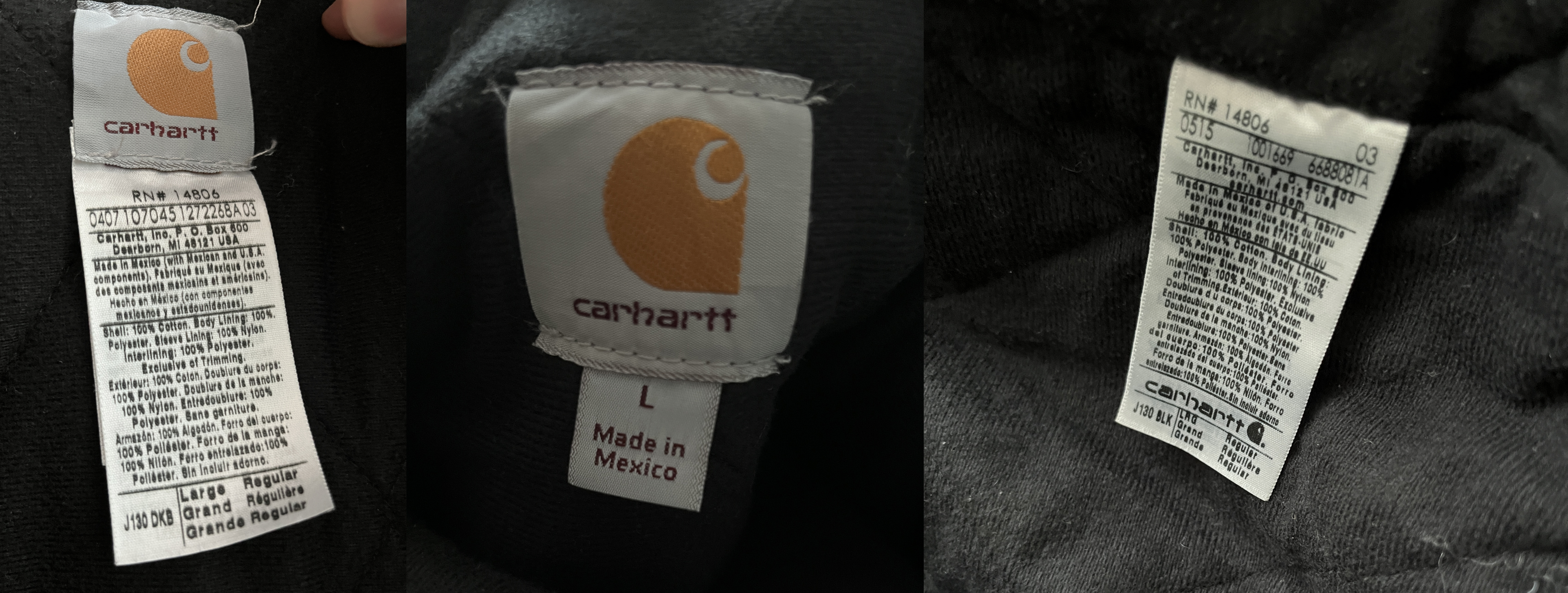 **다만, 택 위치가 조금 다르다. 좀 더 구버전은 목 뒤에 있는 칼하트 택에 사이즈랑 같이 쭉 길게 붙어있는 반면, 좀 더 최근에 나온 제품들은 목 뒤에는 칼하트와 간단히 M, L 등 사이즈만 기재됐고, 나머지 정보는 옷 하단에 택이 따로 있다.