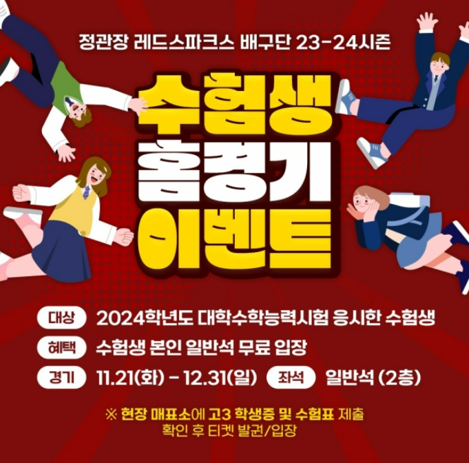 남자프로농구단 ‘정관장 레드부스터스’와 여자프로배구단 ‘정관장 레드스파크스’ 홈경기 수험생 무료 혜택 진행 *12월 말까지 진행하며, 현장 매표소에서 수험표나 고3 학생증을 보여주면 2층 일반석에서 무료 관람 가능