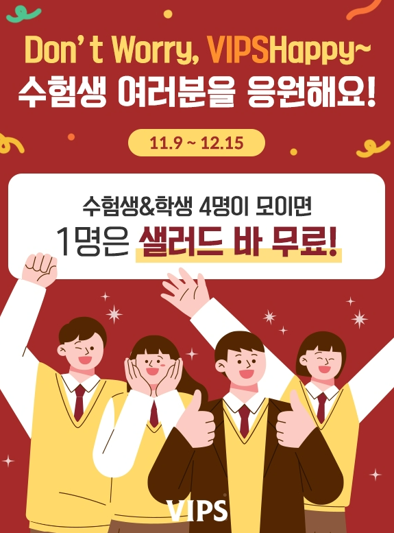 23년 12월 15일까지 샐러드바 3+1 행사 진행 수험생 혹은 중고등학생들은 4인 이상 샐러드바 이용 시에 1인 무료 혜택을 받을 수 있다. 수험표나 청소년증을 제시하기만 하면 된다.