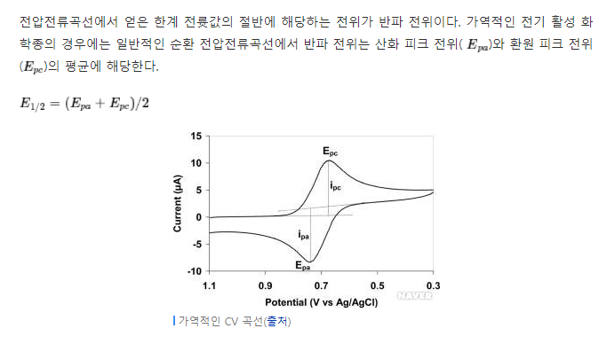 여기서 Vsolvent는 용매의 에너지 준위를, E_onset ox/red는 각 산화와 환원이 시작되는 지점, E1/2는 용매의 반파 준위를 말한다. 반파 전위는 산화와 환원 피크 전위의 평균에 해당한다.