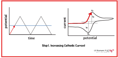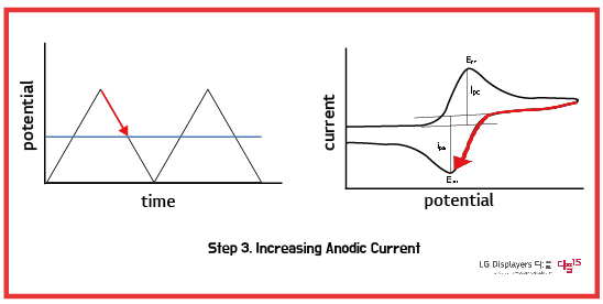 5) 환원되어 생긴 생성물이 소진되면서 전류값이 감소한다. 이와 같은 순서가 계속해서 반복되는 것이 순환 전압 전류법이다.