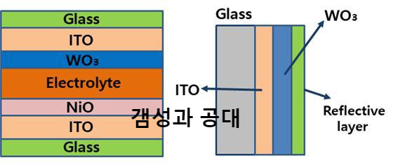 텅스텐은 환원 물질이라 reduction이 일어났을 때, 소자의 색이 변한다. 하지만 NiO. 산화니켈은 산화가 일어났을 때 소자의 색깔이 변한다. 만약 환원이 일어났을 때 산화를 받아줄 물질이 없으면 기기의 효율이 떨어진다.