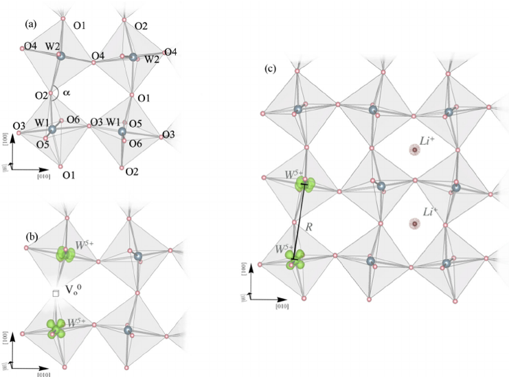 전압을 가해서 환원 반응으로 생긴 폴라론은 빛을 투과시키지 않고 흡수한다. 폴라론은 격자 사이를 자유롭게 이동할 수 있으니 광흡수를 통해 에너지를 받으면서 격자 사이를 계속 이동하는 것. 즉, 변색은 폴라론 전이에 의한 광흡수다.
