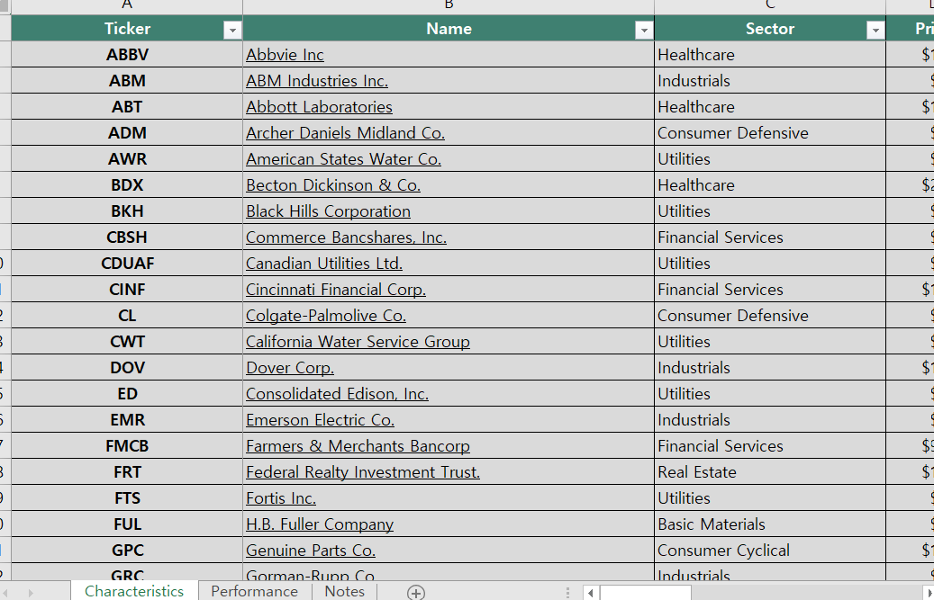 ✅배당률, 배당성장률이 높은 배당 왕족주, 그다음을 이으는 배당 귀족주와 배당 챔피언 기업들 확인이 가능하다. 떠오르는 배당 성장주 등도 확인이 가능