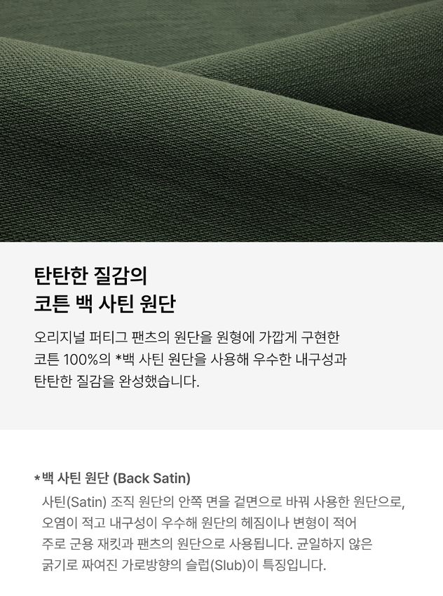 ✅무탠다드에서 나온 '백 사틴 오피서 팬츠'는 '코튼(면)'을 사틴 방식으로 직조를 하고, 안쪽 면을 바깥 쪽으로 활용하여 옷을 만든 것이다.