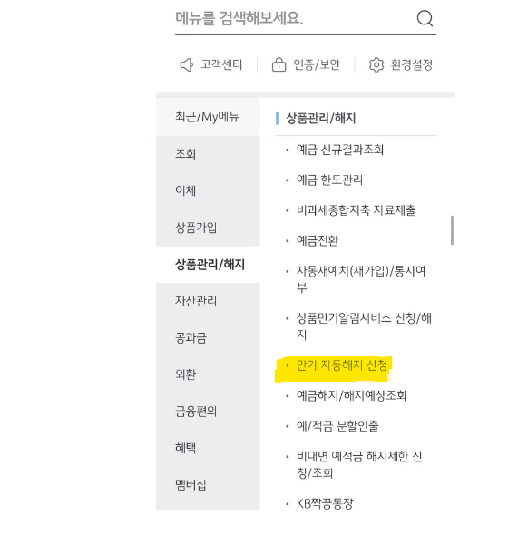 ✅우선 국민은행의 경우 은행 앱을 다운 받은 뒤, 검색창에 '만기 자동해지'를 검색하고, 이를 신청하면 된다. 다만, 적금 만기 전에 미리 신청해야 한다. 그러면 만기일에 알아서 지정한 당행 일반계좌로 입금된다. *혹은 상품관리/해지 메뉴에 '만기 자동해지 신청' 클릭