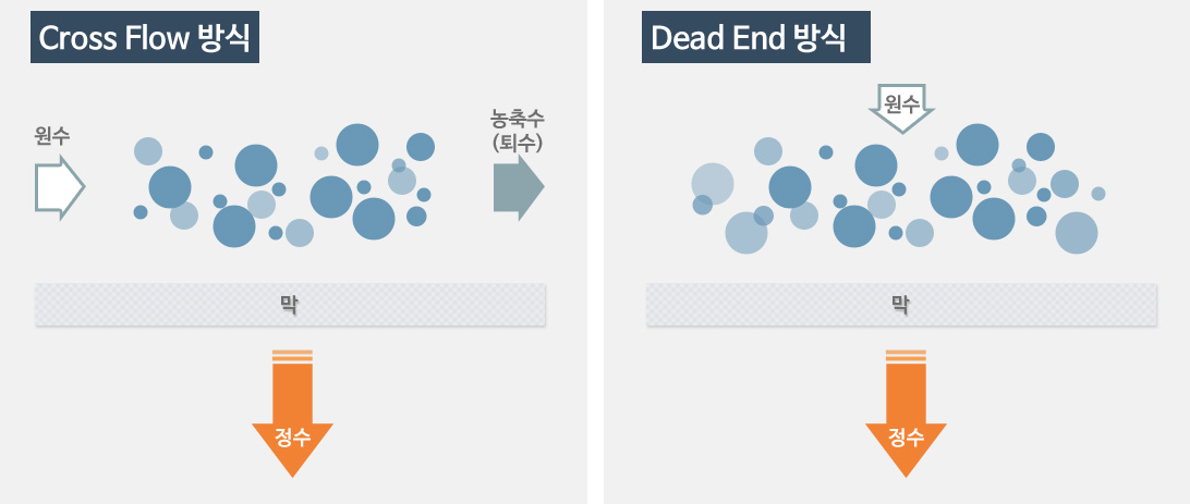 여과방식은 아래와 같이 부분여과(Cross flow)와 전량여과(Dead end) 방식으로 나뉜다. 전량여과 방식은 원수의 전량이 여과되므로 버려지는 물이 없다. 다만, 그만큼 필터의 수명이 짧기 때문에 오염물이 비교적 적은 물을 여과할 때 사용하는 것이 적합하다.
