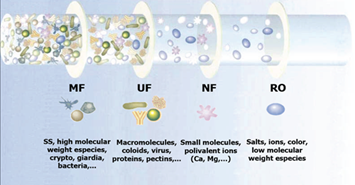 | 한외여과 (UF : Ultra Filter) | 0.001~0.1㎛ | 부유물질, 콜로이드, 세균, 조류, 바이러스, 크립스토포리디움, 자이디아, 포낭, 부식산 등 |