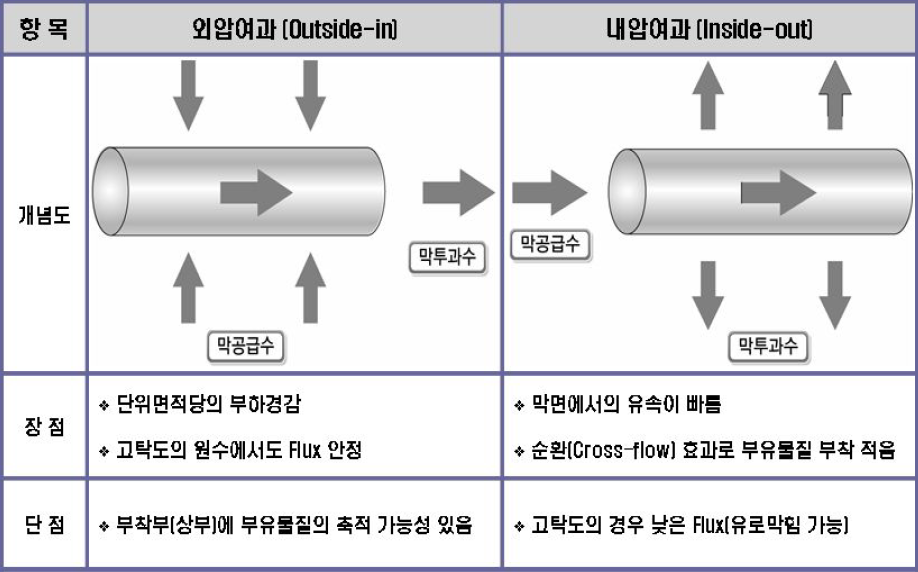 중공사막은 여과되는 원리는 같지만, 원수가 바깥에서 안으로 들어가 안쪽에서 여과된 물이 나오는 외압여과와 원수가 안으로 들어가 여과된 물이 바깥으로 나오는 내압여과로 나뉜다.