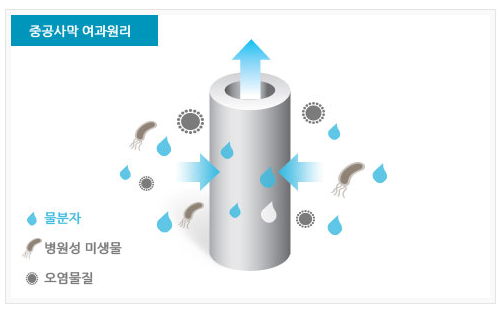 | 정밀여과 (MF : Micro Filter) | 0.1~1㎛ | 부유물질, 콜로이드, 세균, 조류, 바이러스, 크립스토포리디움, 포낭, 자이디아 |