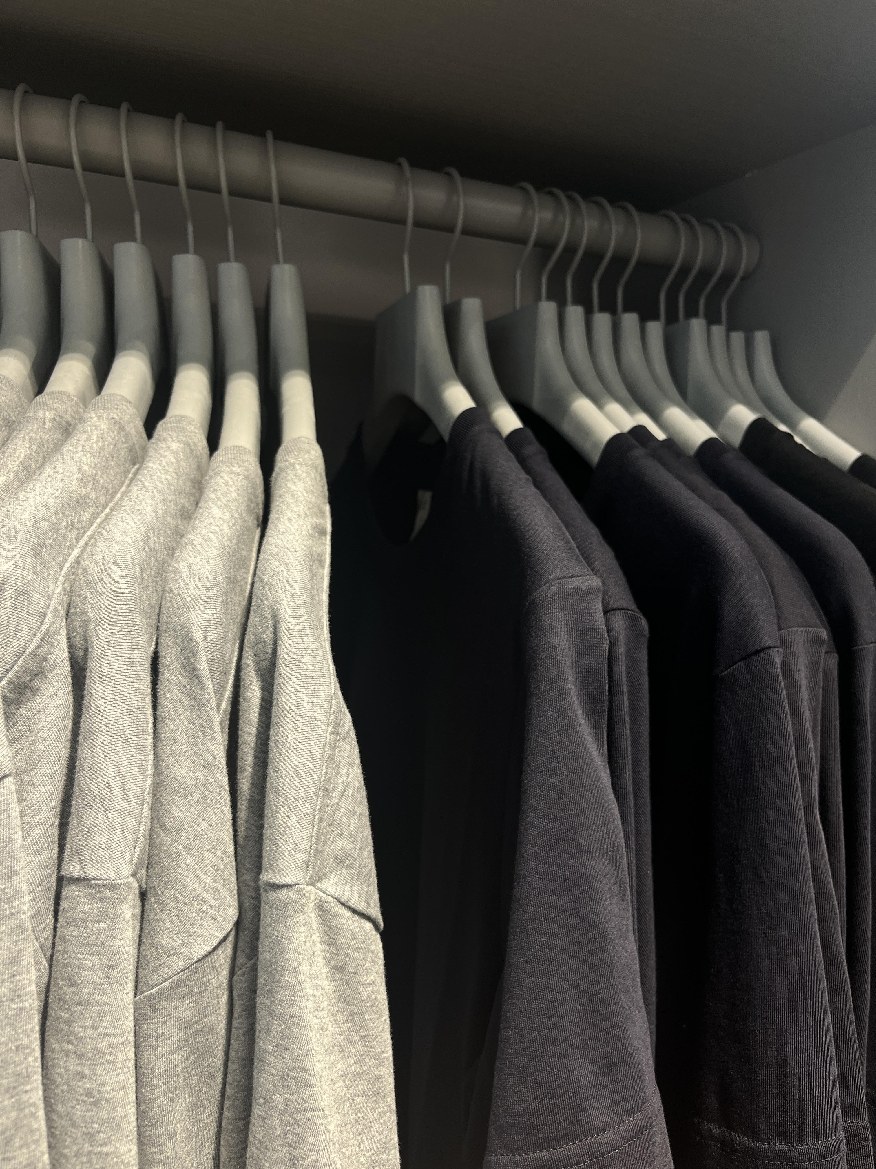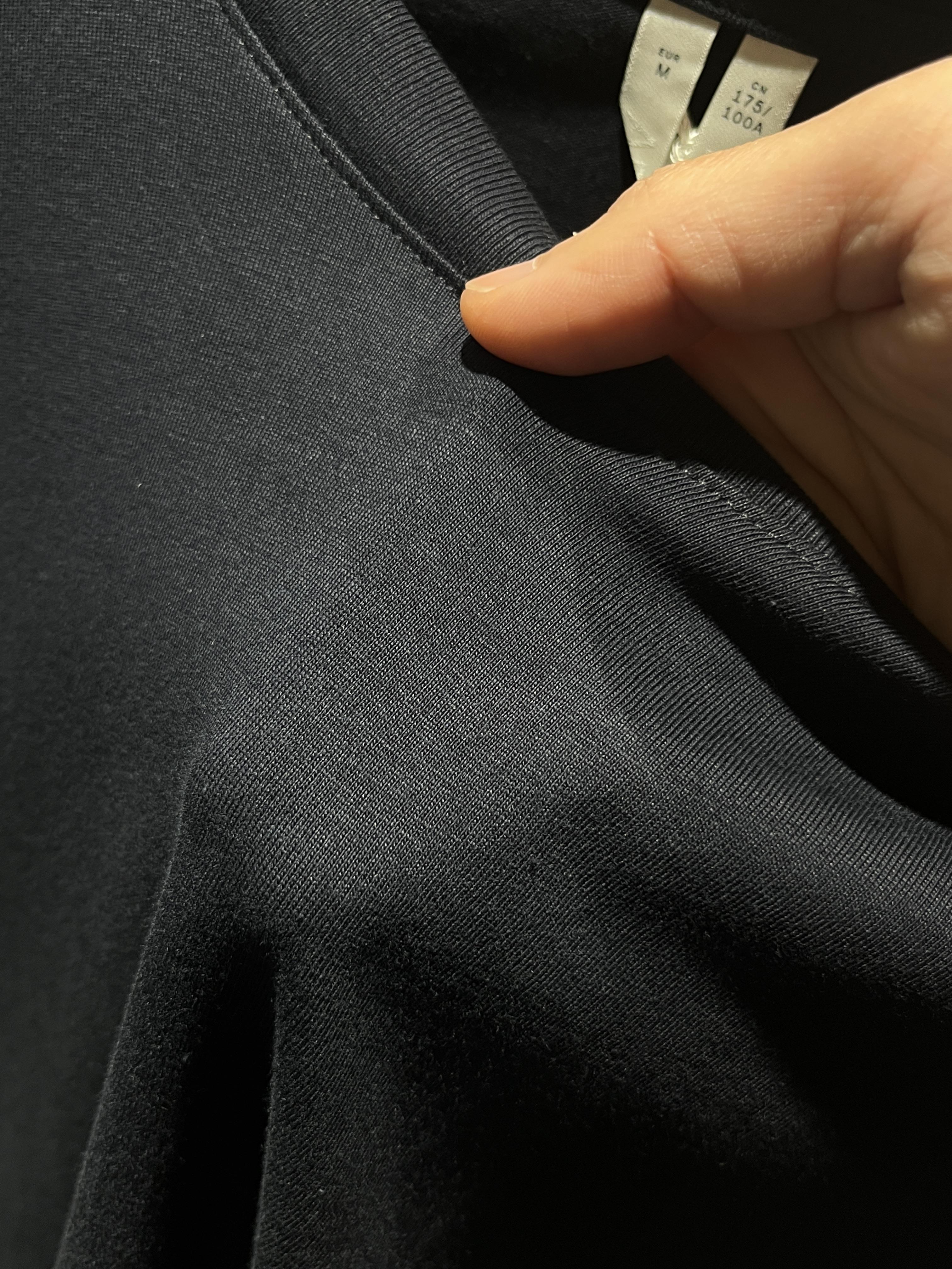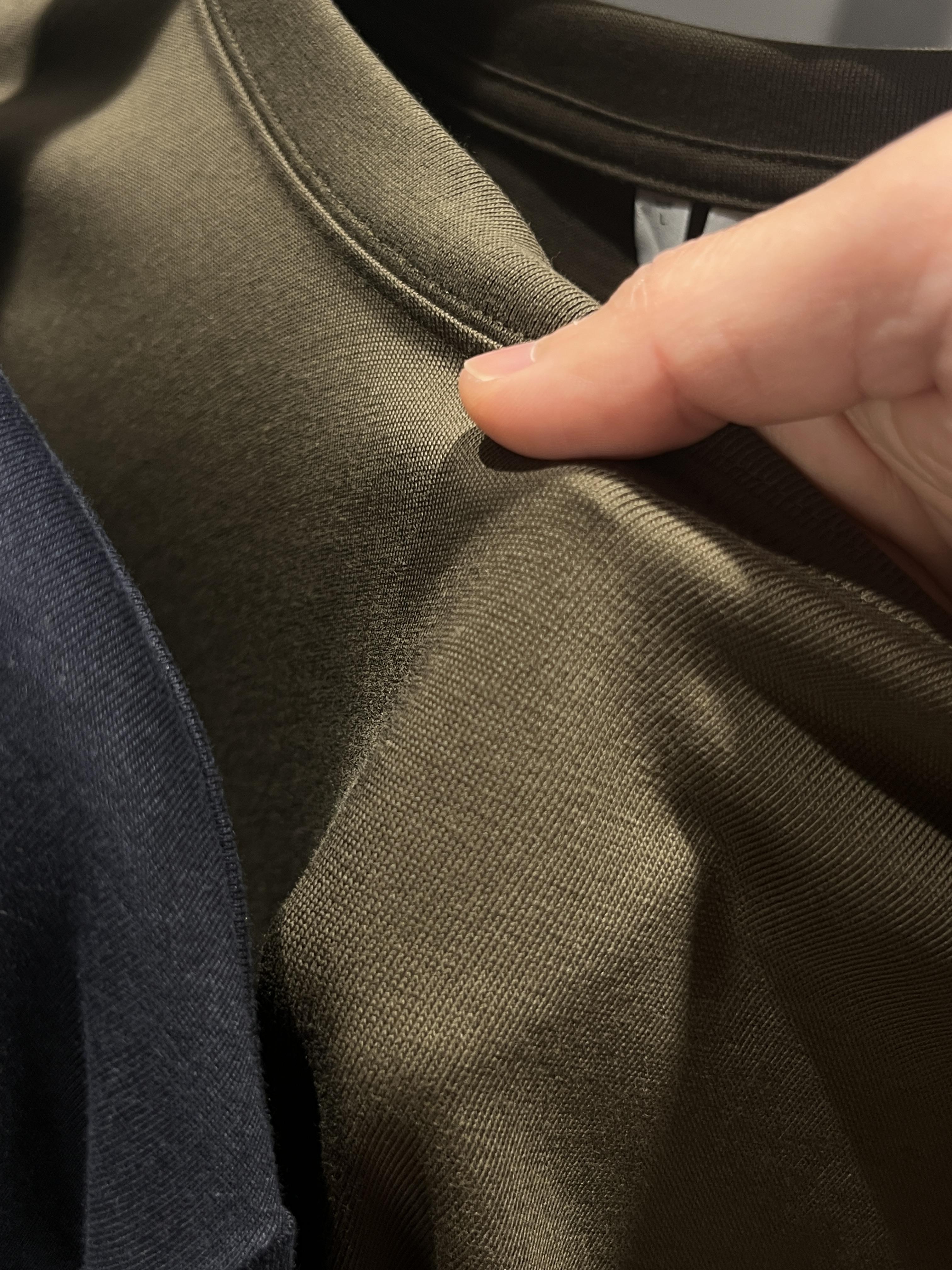 왼쪽이 아르켓 라이트웨이트, 오른쪽이 미드웨이트이다. 눈으로 봤을 땐 두 티셔츠의 차이를 느끼기 힘들다. 넥라인은 만져봤을 땐 소재 때문에 부드러워서 튼튼할까 싶었는데 입어볼 때는 생각보다 튼튼하겠다는 생각이 들었다.