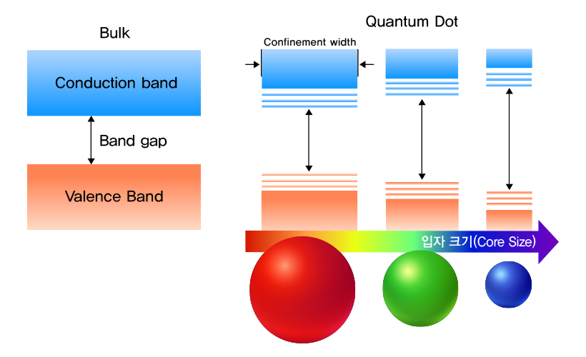 QLED는 '퀀텀 닷 발광 다이오드(Quantum dot Light Emitting Diode)'의 줄임말이다. OLED와 마찬가지로 전류를 가하면 빛을 내는데, QLED는 수 나노미터의 반도체 결정을 이용한 것이다. 퀀텀 닷은 입자 크기에 따라 발현되는 색깔이 다르다. *크기가 작아질수록 RGB