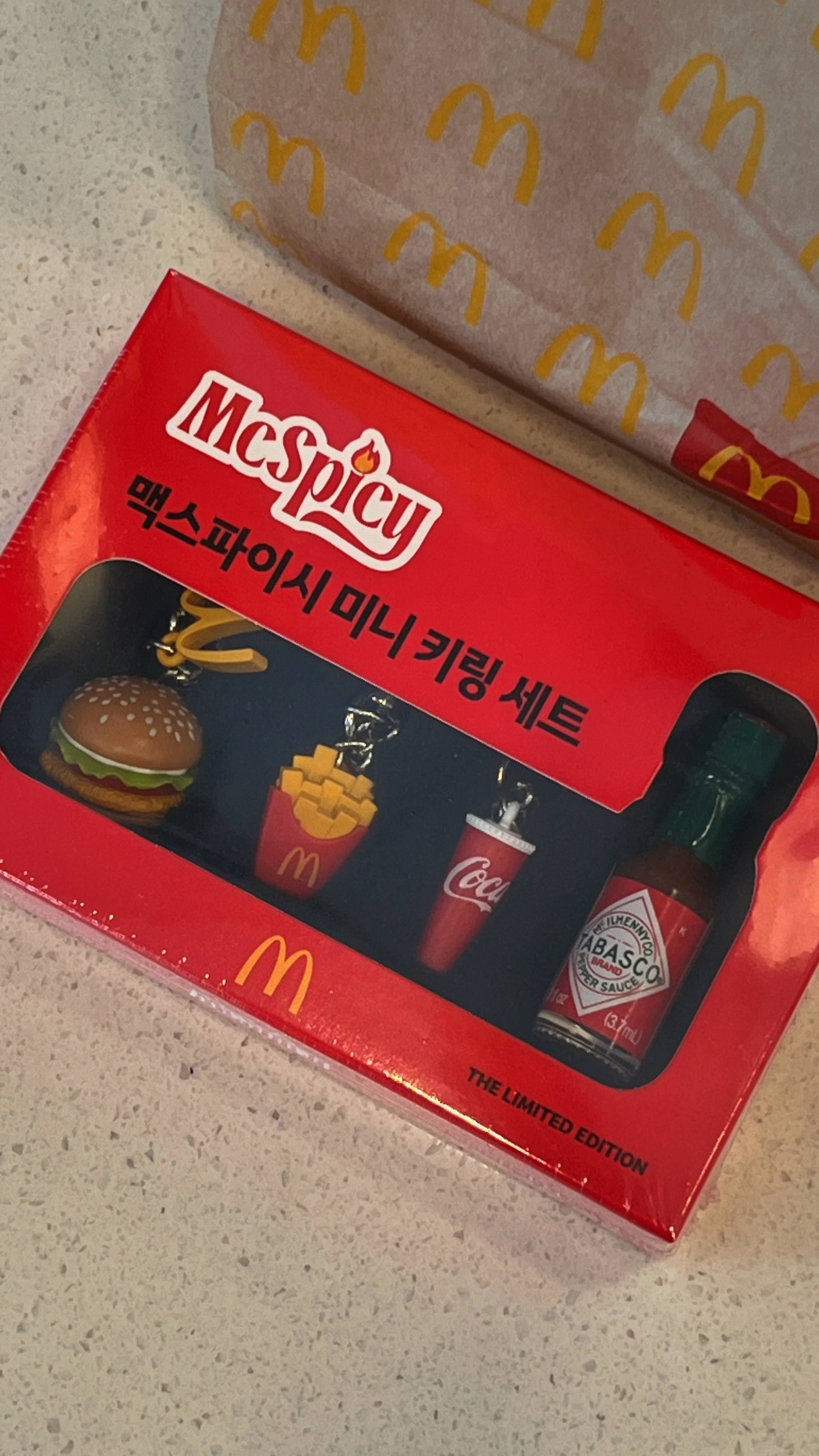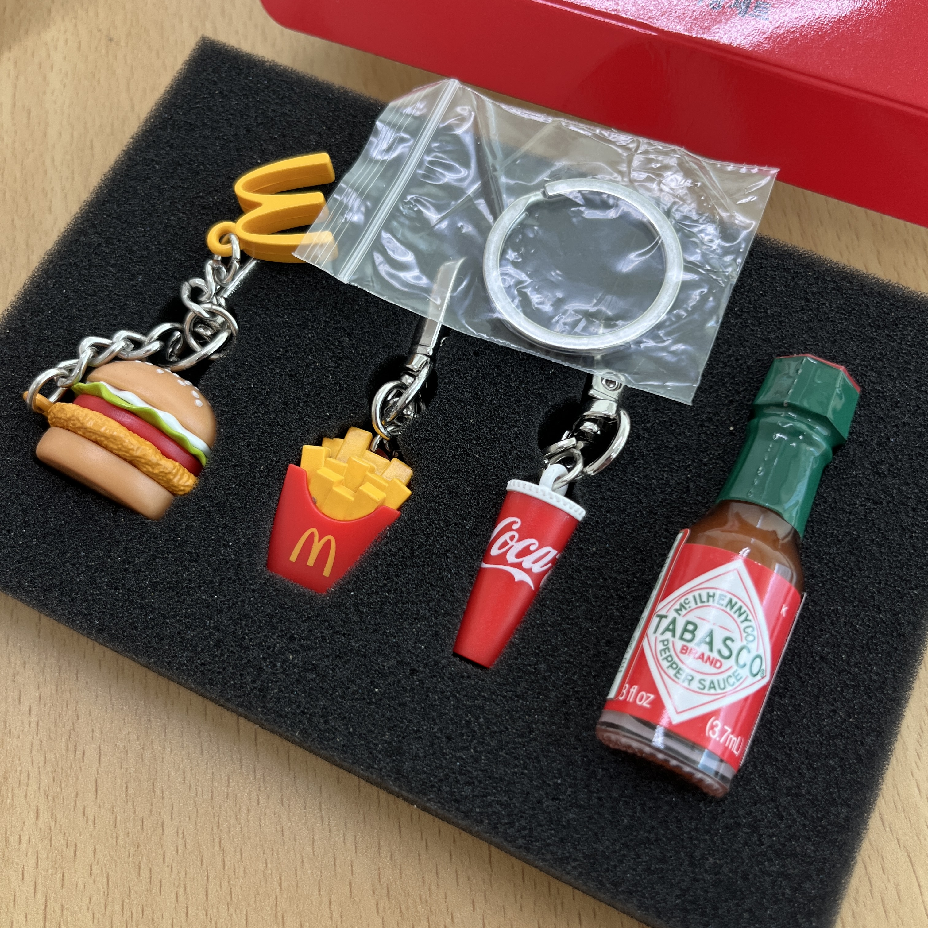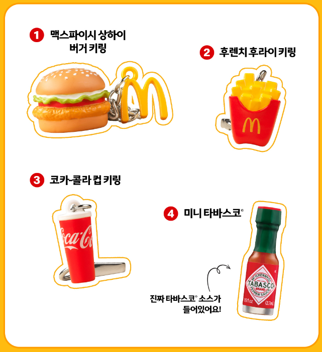 구성은 맥도날드에서 홍보한 사진과 동일하다. 저렇게 4개 구성에 더 크게 달라고 원형 링도 한 개 들어가 있다. 다만, 미니 타바스코엔 키링이 걸려있지 않다. 아무래도 식품인지라 그런 듯 싶다.