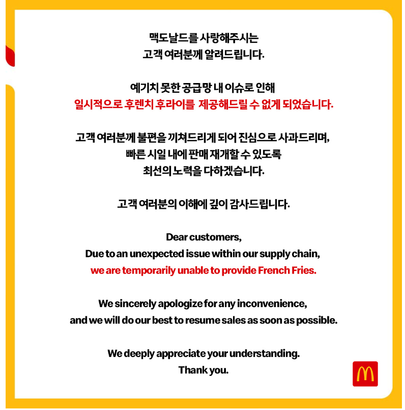 맥도날드는 예기치 못한 공급망 내 이슈로 인해 일시적으로 후렌치 후라이를 제공해드릴 수 없게 됐다며, 고객 여러분께 불편을 끼쳐드리게 되어 진심으로 사과드리며, 빠른 시일 내에 판매 재개할 수 있도록 최선의 노력을 다하겠다는 게시물을 남겼다.