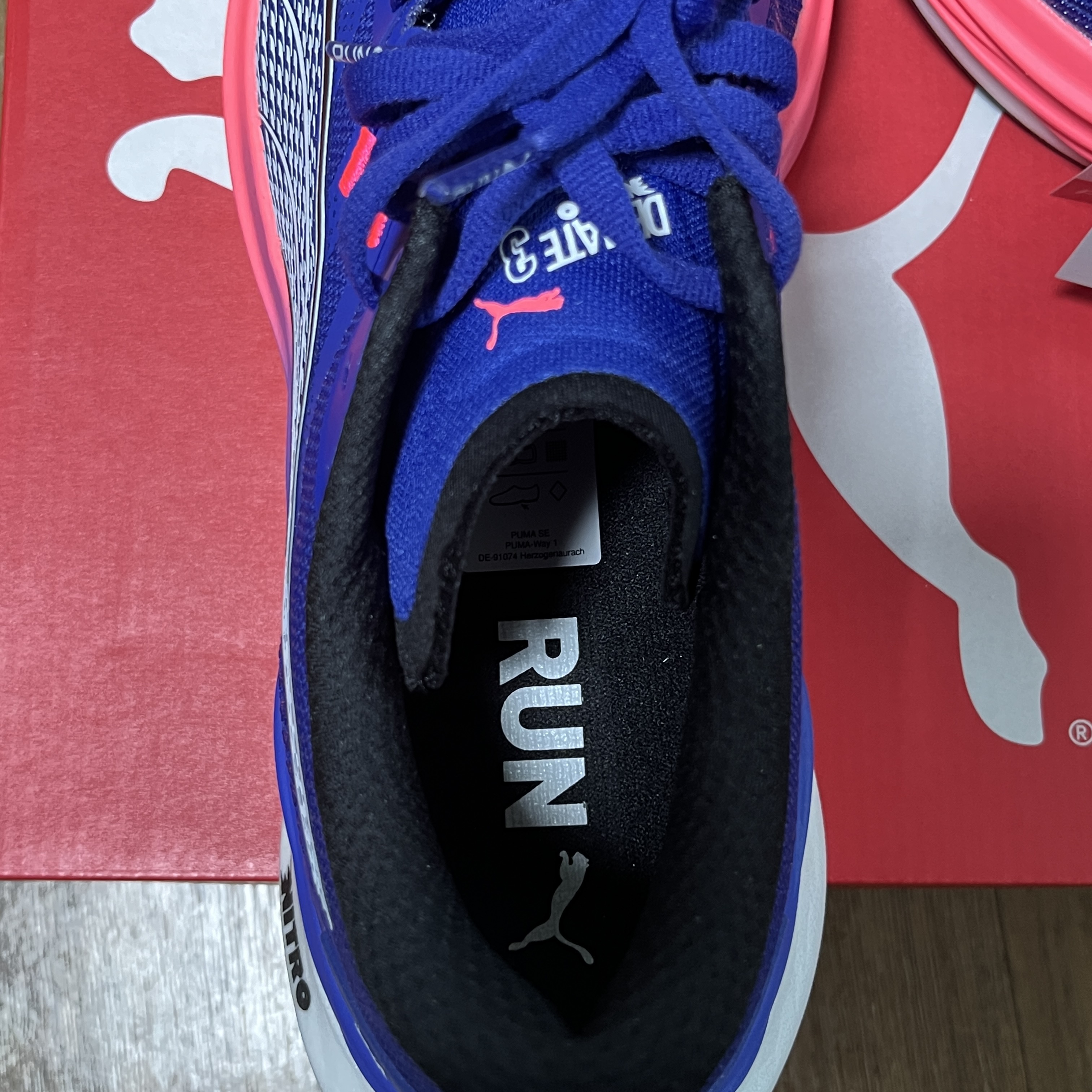 푸마 디비에이트 나이트로 3 선셋 글로우의 정확한 색상 명칭은 'Lapis Lazuil-Sunset Glow'. 품번은 309707 05이다. 가격은 209,000 정가를 그대로 주고 구입하였다. 메이드인 베트남이었고 제조년월은 따끈따끈한 24년 5월.