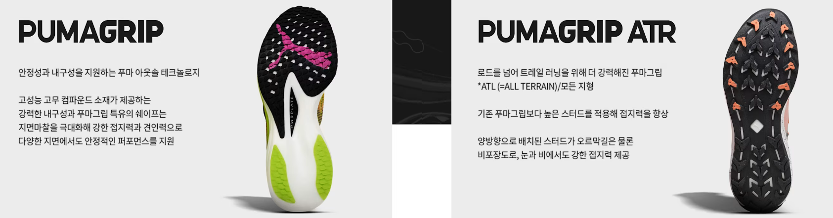 아웃솔은 푸마가 자랑하고, 많은 사람들이 리뷰로 증명한 푸마 그립. 트레일 러닝용 그립이 따로 있음에도 로드 러닝화 그립도 접지력과 내구도가 상당히 좋다고 한다.