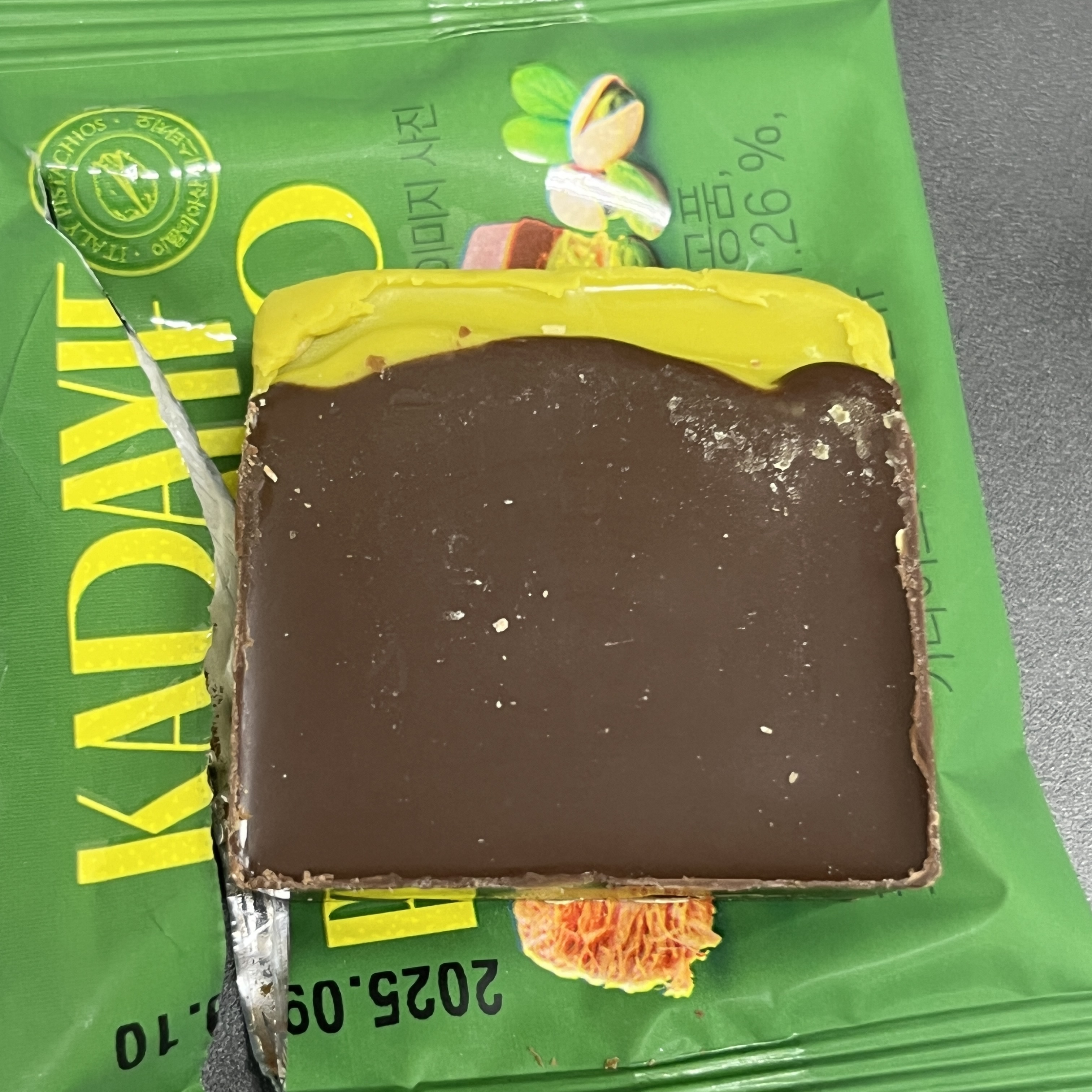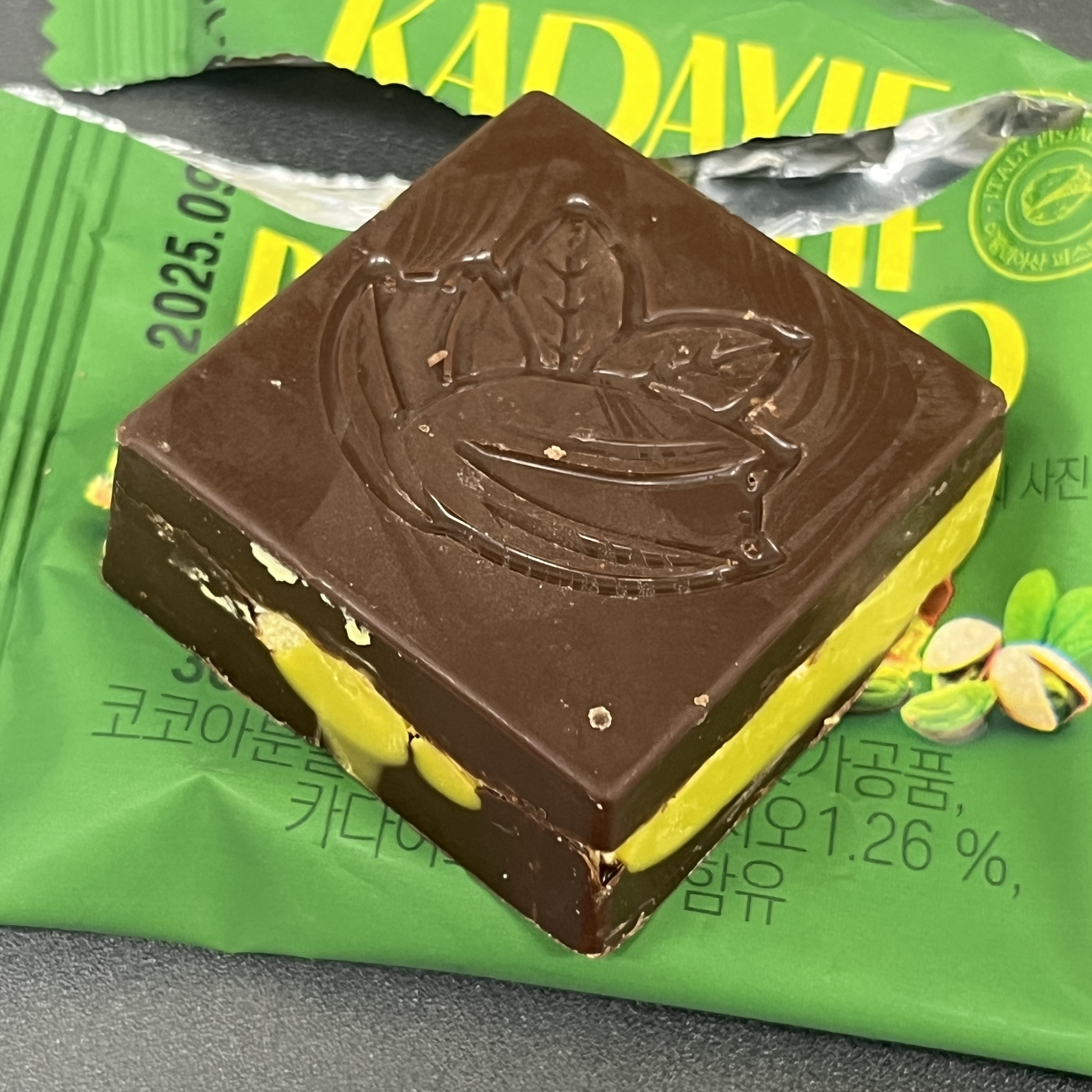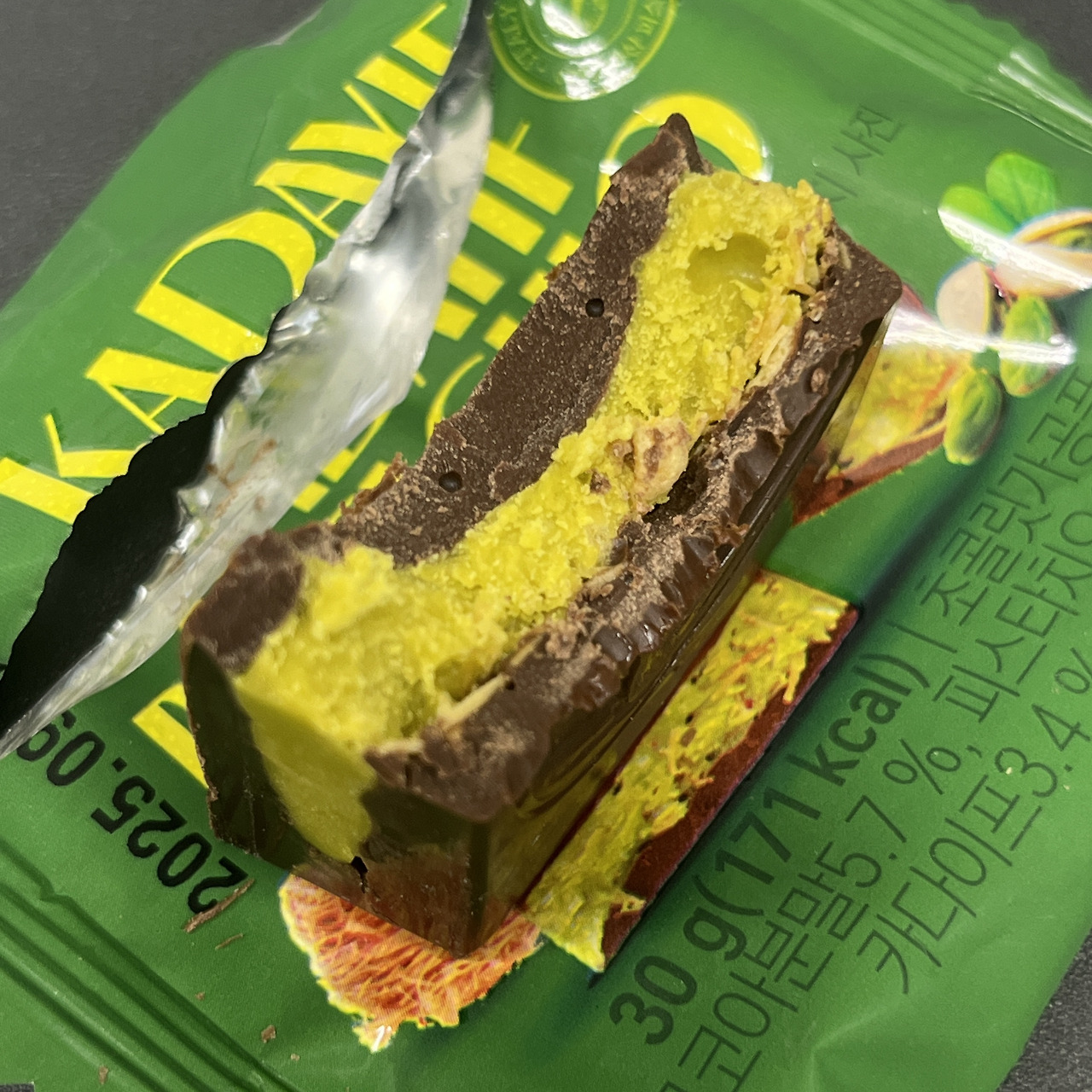 약간 미니쉘 느낌이 나게 생겼고, 썩 마감 퀄리티가 그렇게 좋아보이진 않는다. 초콜릿 사이엔 피스차키오와 카다이프가 들어있다. 카다이프 때문에 씹는 맛이 좀 있고 그렇게 많이 들어있던 것 같진 않다. 아마 이는 제품마다 조금씩 운빨이 있을 수도 있을 것 같다.