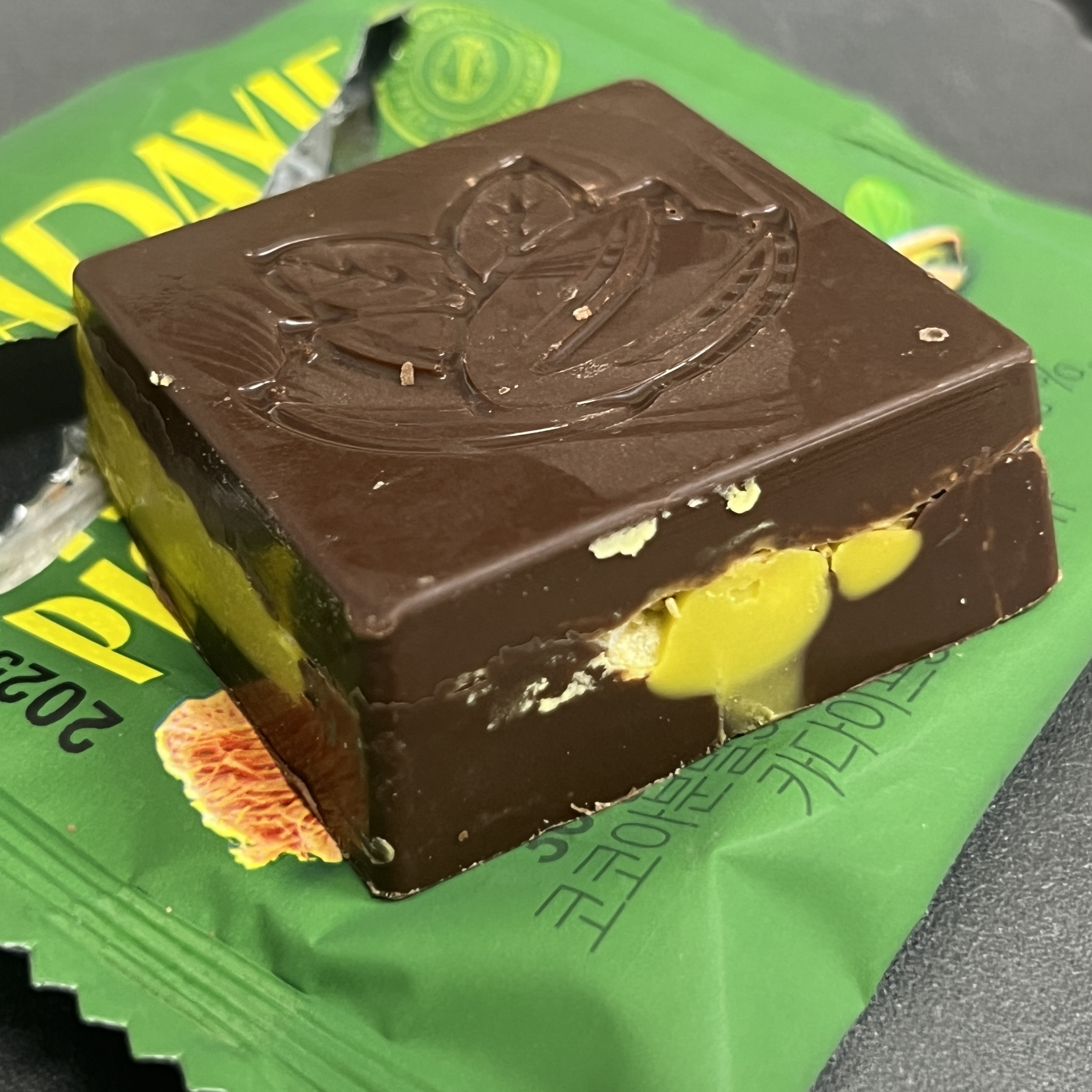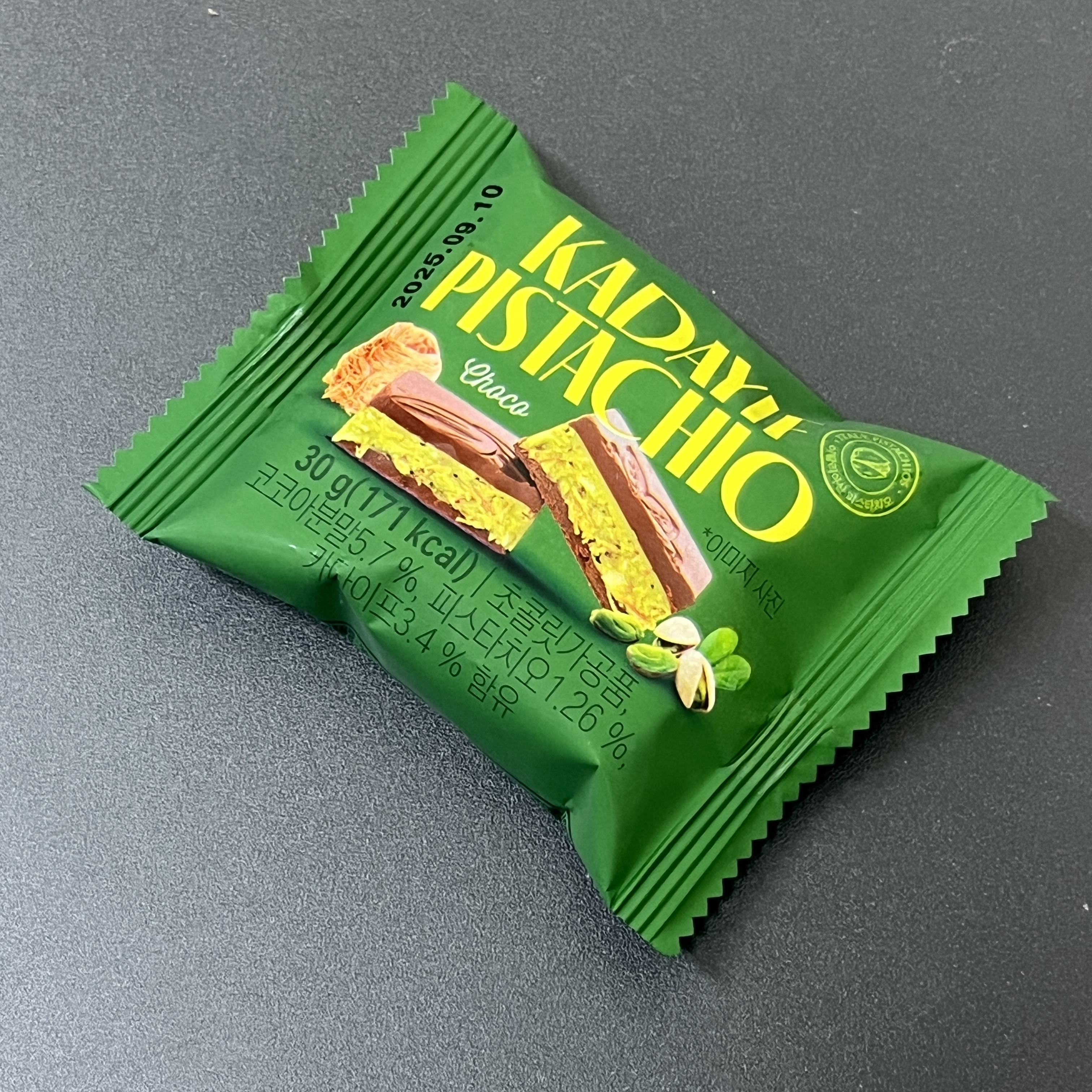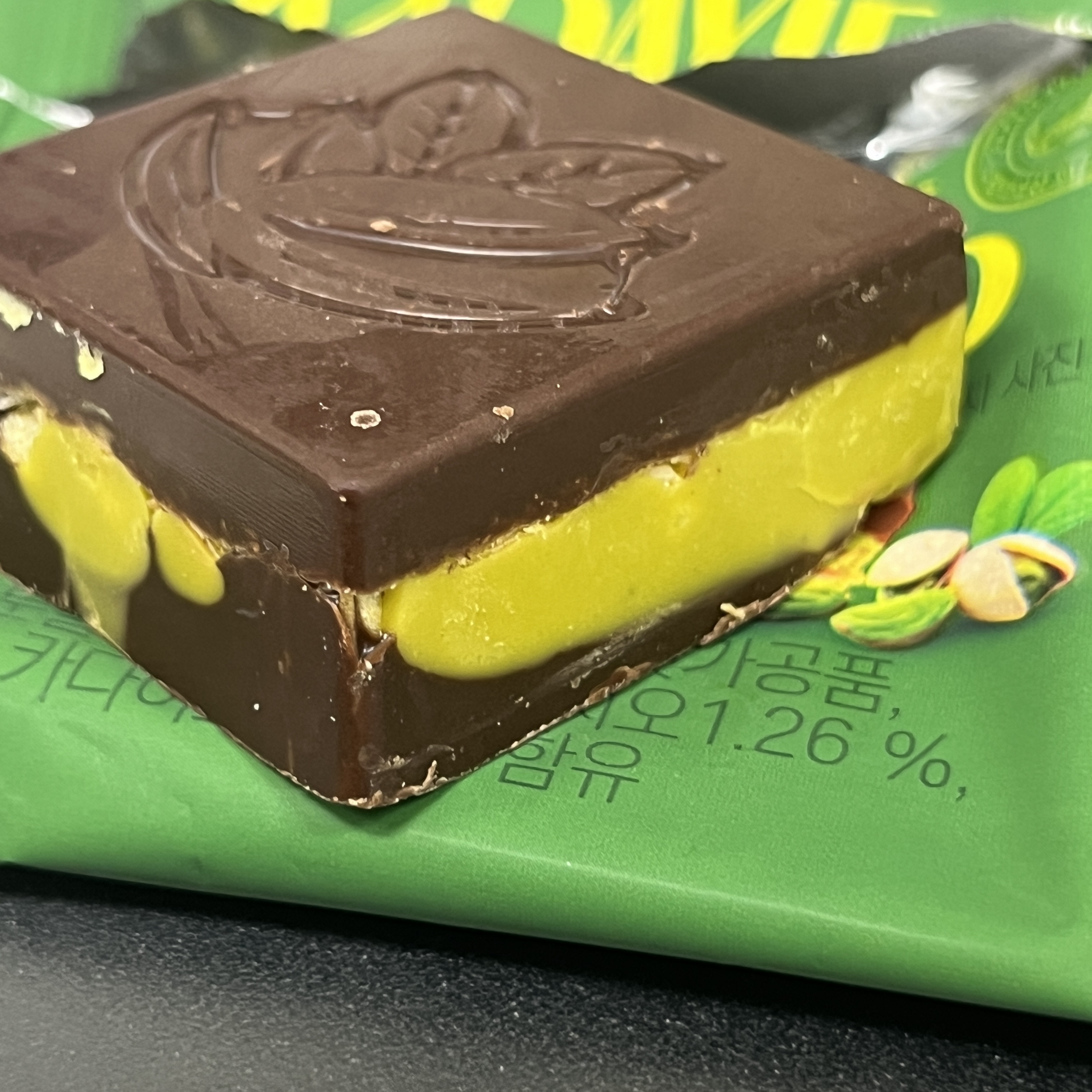 약간 미니쉘 느낌이 나게 생겼고, 썩 마감 퀄리티가 그렇게 좋아보이진 않는다. 초콜릿 사이엔 피스차키오와 카다이프가 들어있다. 카다이프 때문에 씹는 맛이 좀 있고 그렇게 많이 들어있던 것 같진 않다. 아마 이는 제품마다 조금씩 운빨이 있을 수도 있을 것 같다.