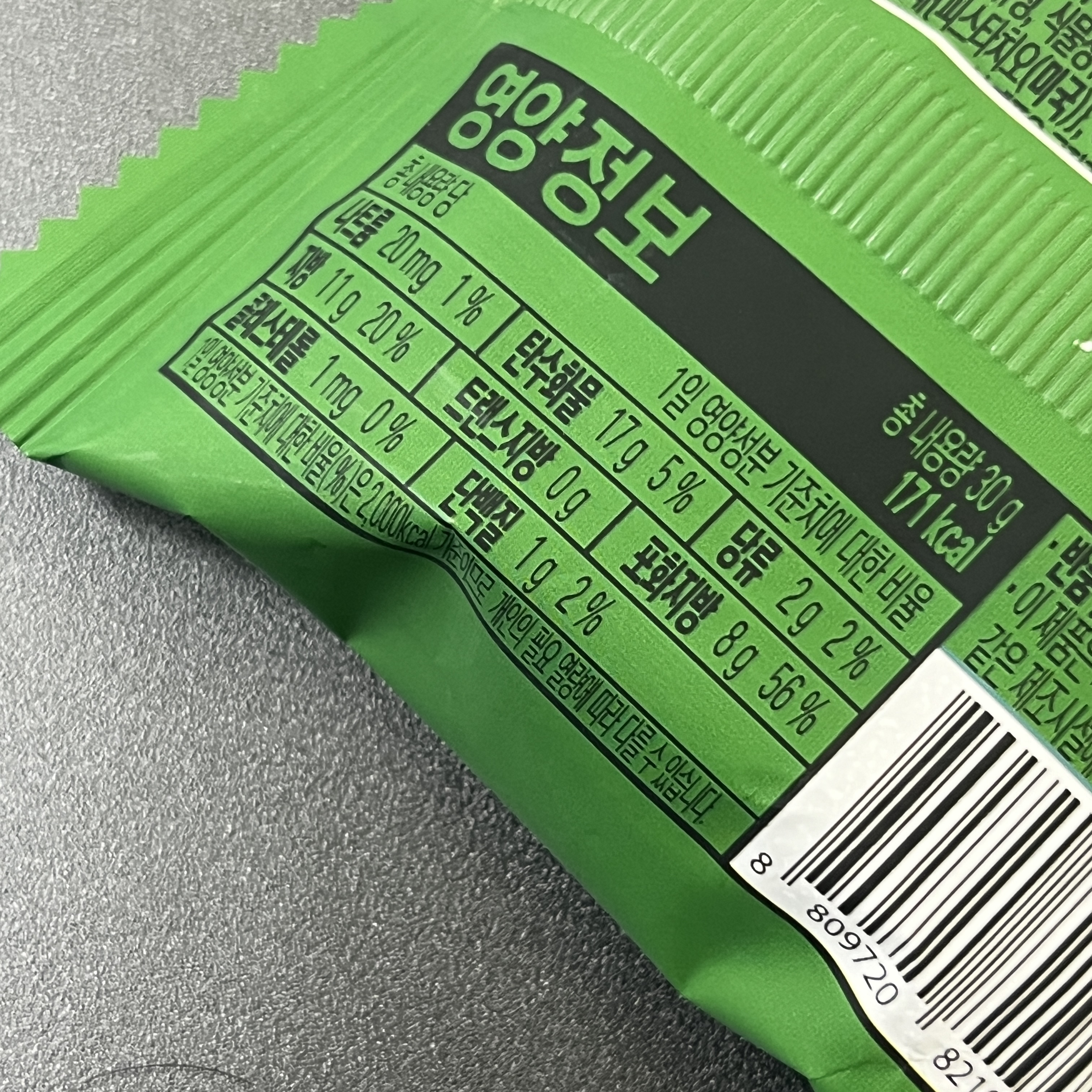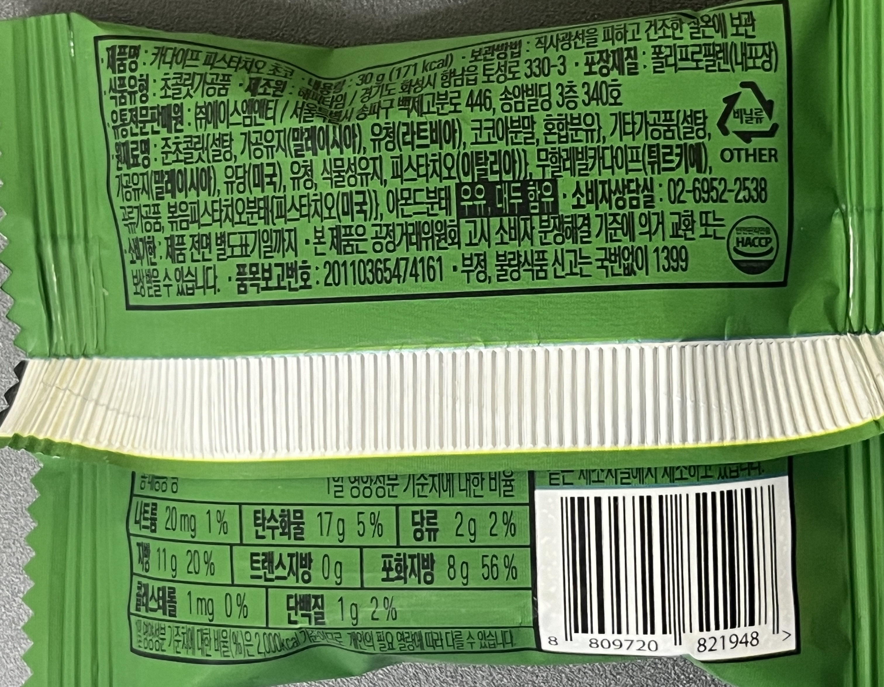 30g의 171칼로리, 포화지방이 56%이며, 가격이 싼 편이 아니지만 준초콜릿이다. *준초콜릿은 카카오버터 외에 유지가 들어가고 카카오함량은 20~30%이고 조금 더 낮을 수도 있다. 10% 이상은 무조건임.