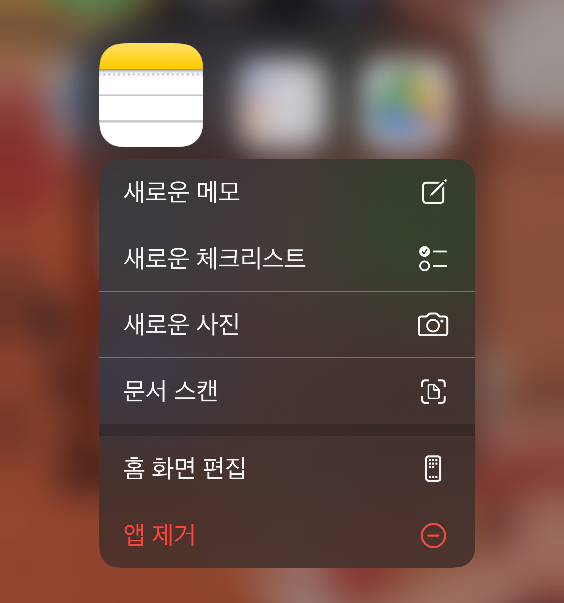 사용법은 간단하다. 우선 아이폰 기본 메모 어플을 꾹 눌러준다. 그러면 '문서 스캔'이라는 말을 찾을 수 있다. 누르면 바로 카메라가 켜진다.