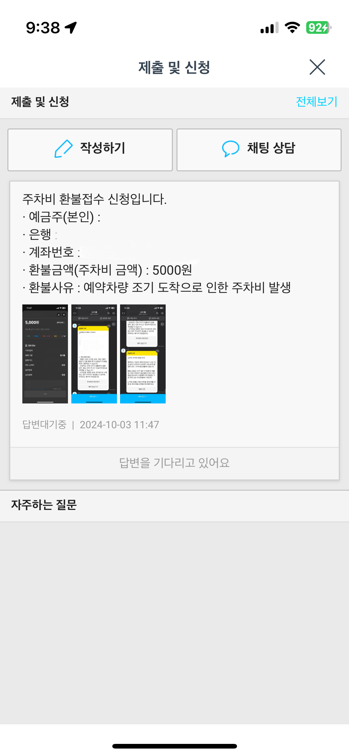 주차비는 5,000원이 나와 일단 지불한 후에 쏘카 고객센터를 통해 주차비 환불을 신청했었다.