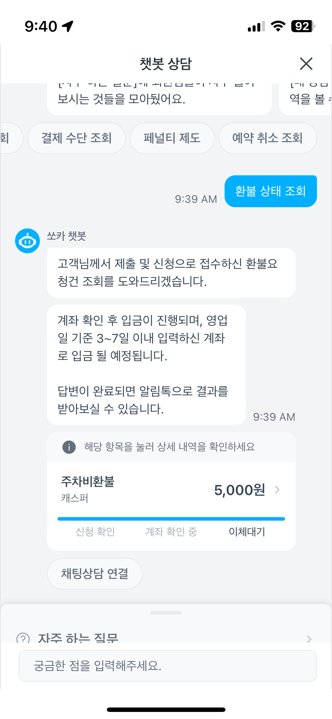 그러다 챗봇으로 쳐보니 현재 환불상태를 조회할 수 있었고(접수 완료된 상태), 영업일 기준 3~7일까지 소요될 수 있다는 안내를 받았다.
