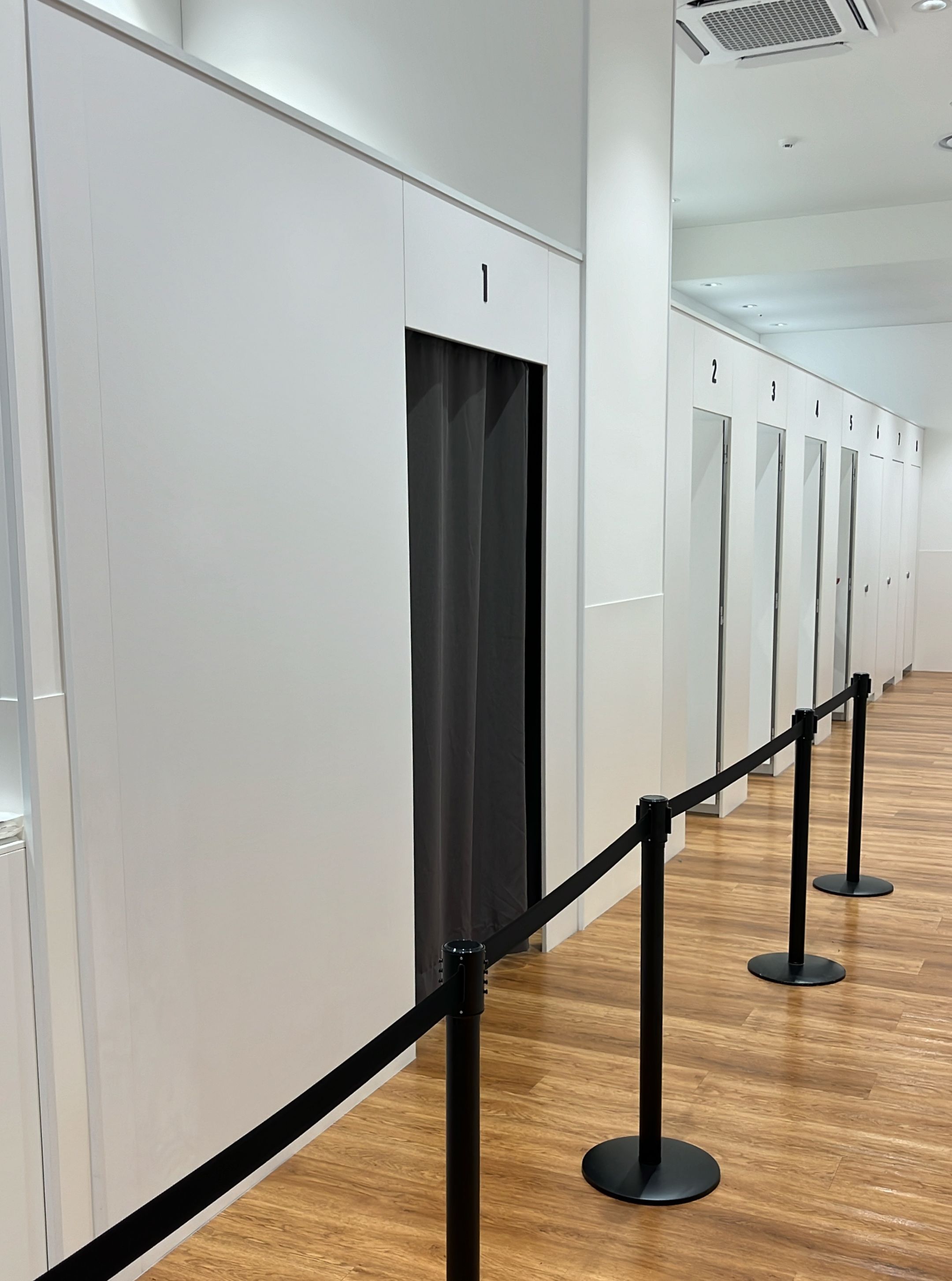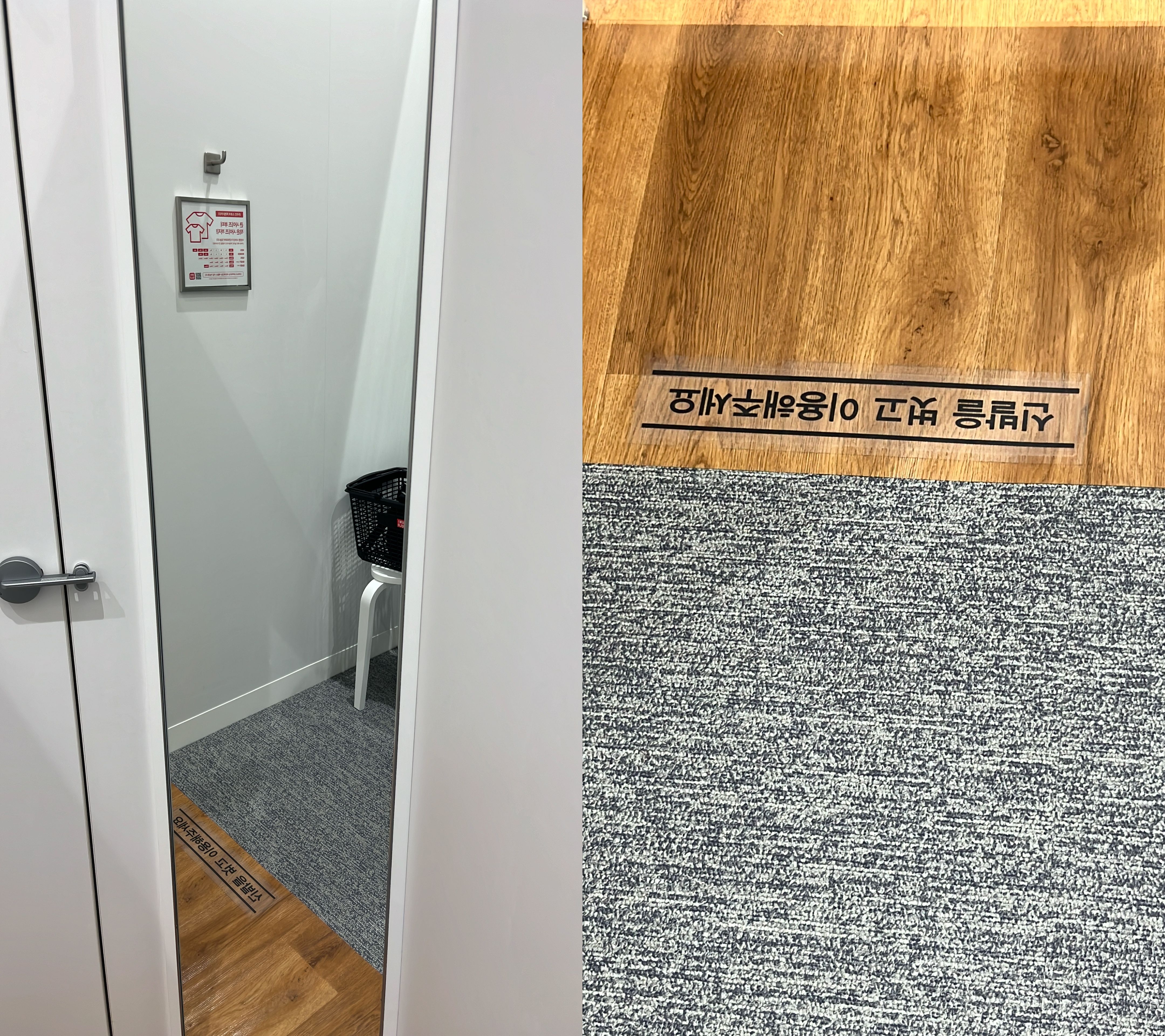 유니클로 광교점에서 좋았던 것 중 하나인 탈의실. 탈의실이 1번부터 8번 방까지 있었던 것 같다. 들어가면 신발을 벗고 들어가라는 안내판과 함께 발매트를 볼 수가 있다.