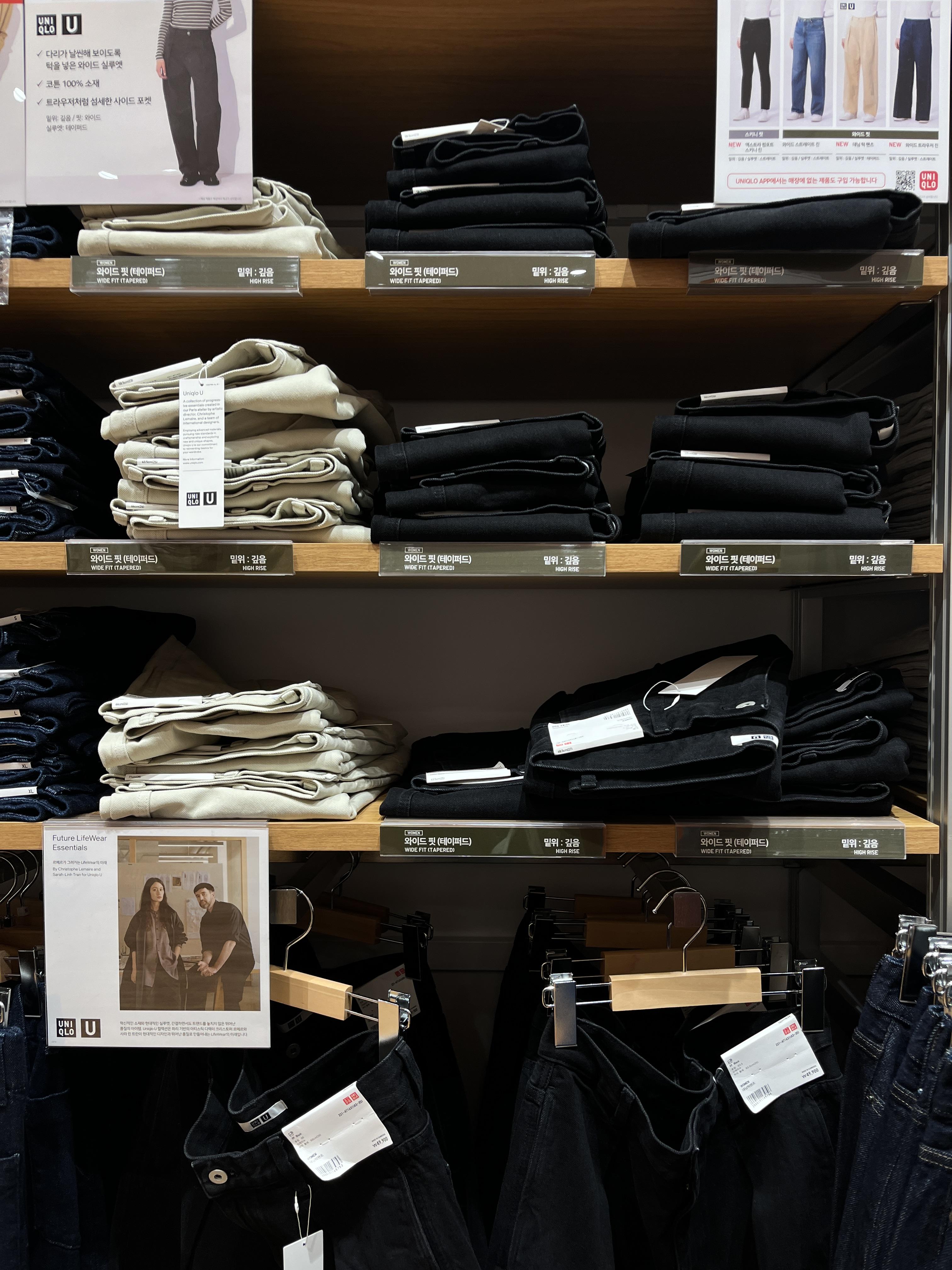 나는 온 김에 바지 좀 보러 다녔다. 아직 유니클로 광교점은 생긴 지 얼마 안 돼서 그런지 유니클로 앱에서 실시간 재고 확인이 어려웠다. 보고 싶었던 건 유니클로 U 우먼스 라인에 데님턱팬츠.