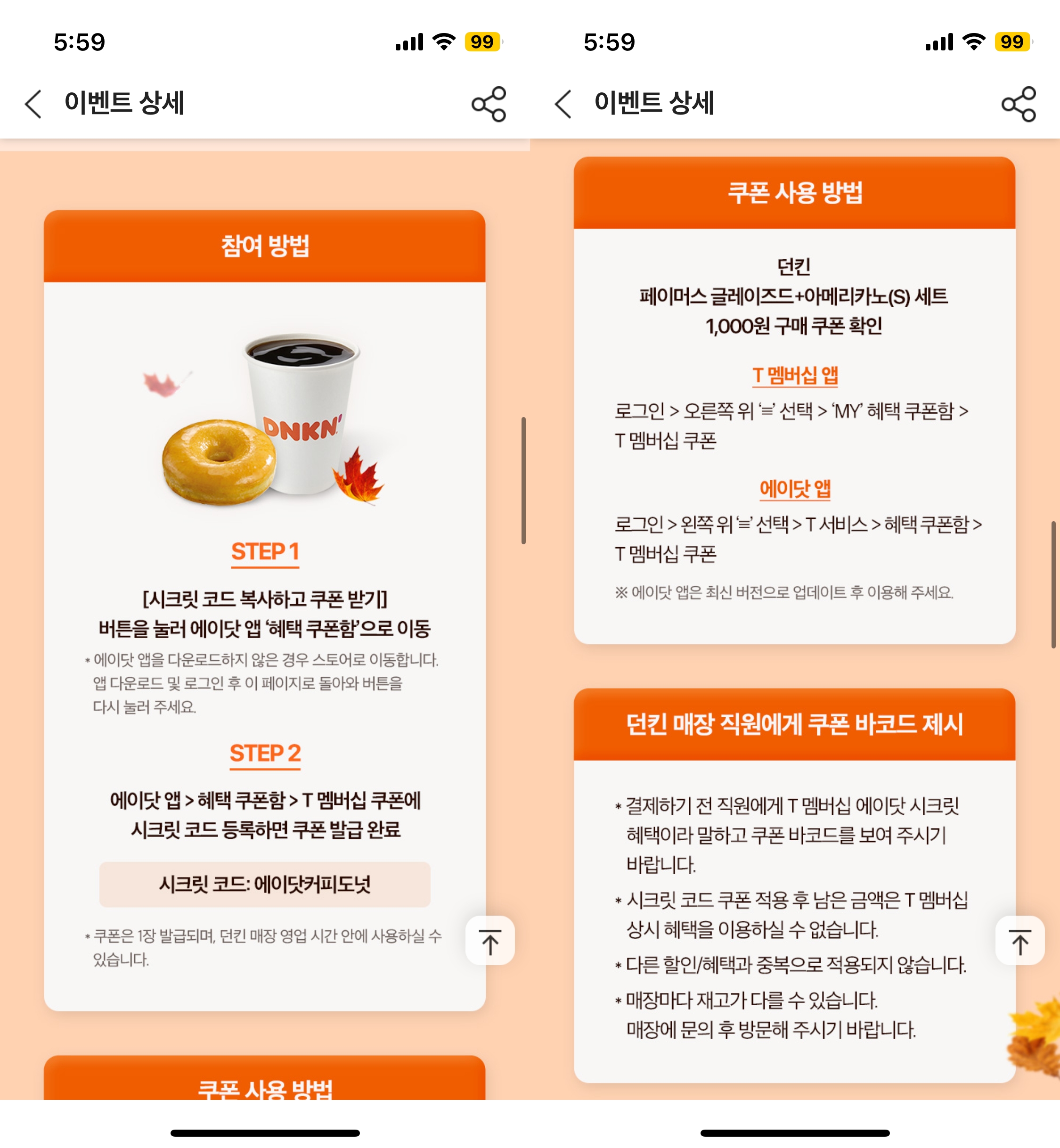 이후 해당 쿠폰을 매장 직원에게 보여주면서 결제하면 짠. 커피와 도넛을 천 원에 얻을 수 있다. 단, 키오스크 등으로는 결제가 안되고 매장 직원에게 직접 보여줘야 한다. 캡처본은 인정 안 해준다.