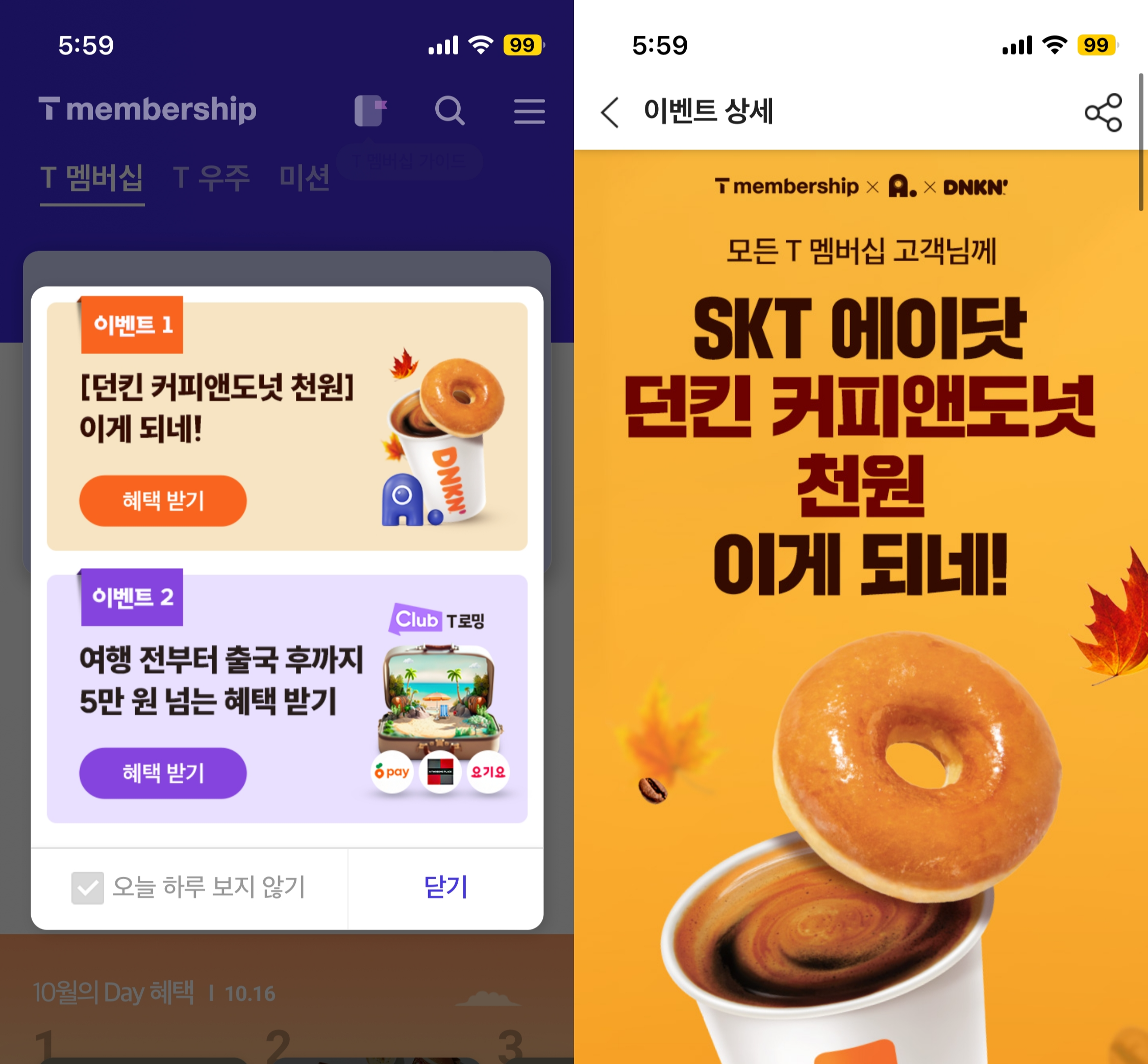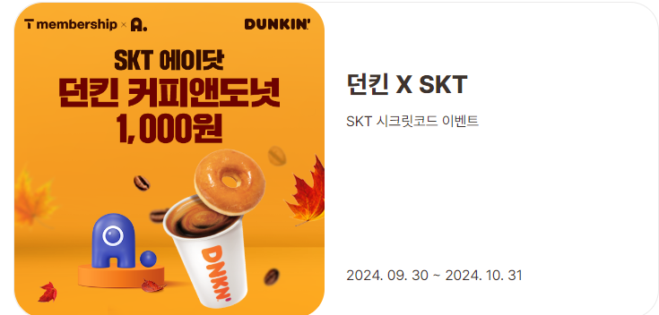 SKT 에이닷 멤버십 고객 던킨 커피앤도넛 천 원 이벤트