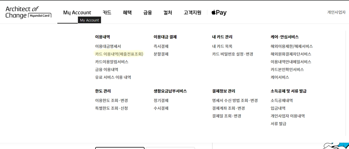 현대카드의 경우, 먼저 현대카드 홈페이지를 들어간다. 로그인을 한 후에 My account에서 카드 이용내역을 클릭한다.