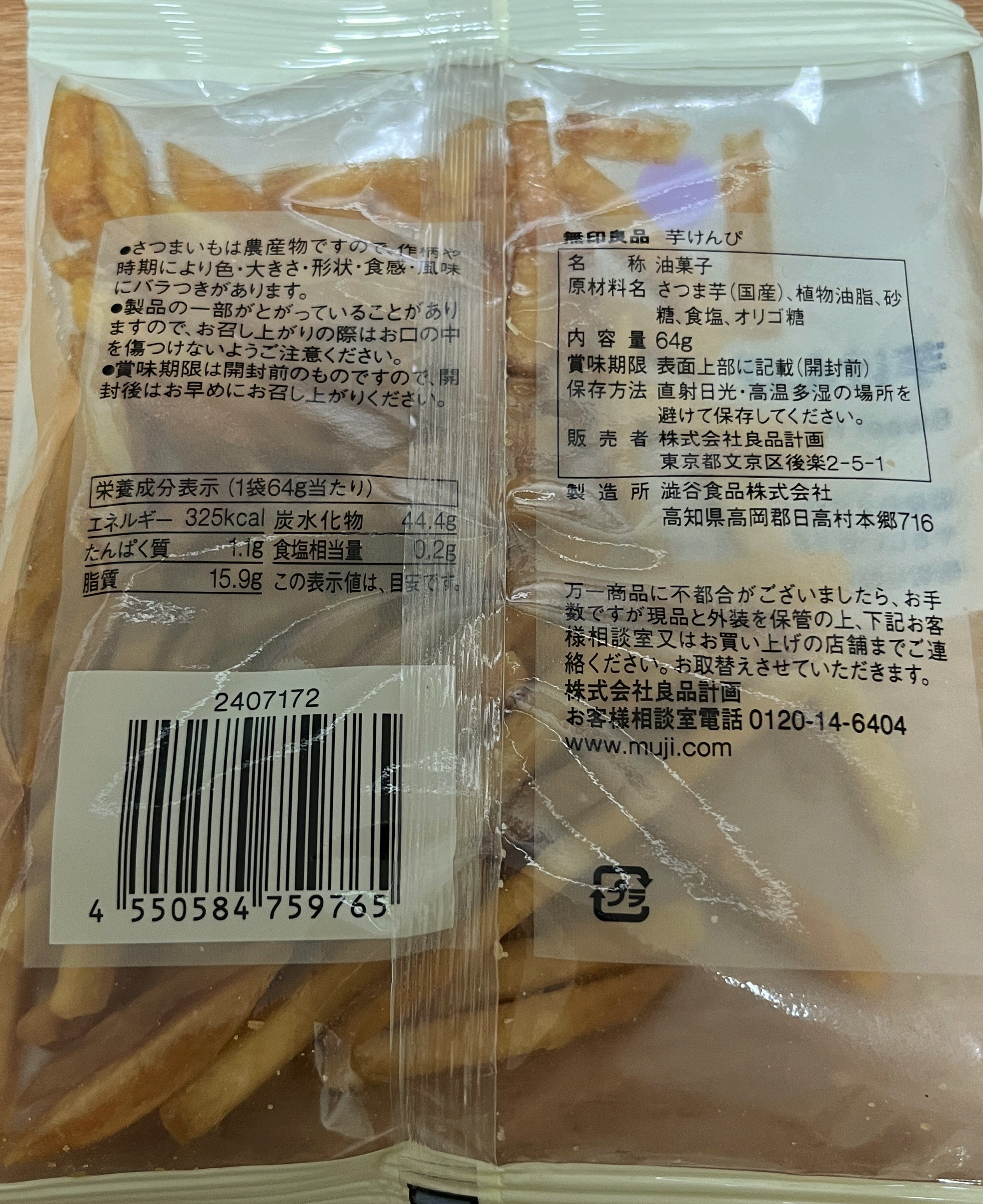 무인양품은 생활용품 말고도 음식도 인기가 많은데, 무인양품 과자를 좋아하는 사람도 많다. 이중 꽤나 명성이 좋은 것이 무인양품 고구마스틱.