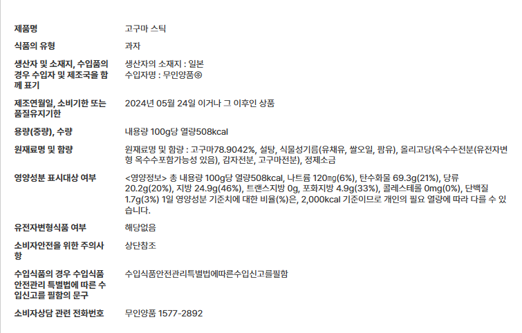 수입원은 일본, 고구마가 대부분이고, 설탕, 식물성기름, 옥수수고당, 소금 등이 들어가 있다. 용량은 100g이고 총 508kcal. 소비기한은 제조일로부터 120일이다.