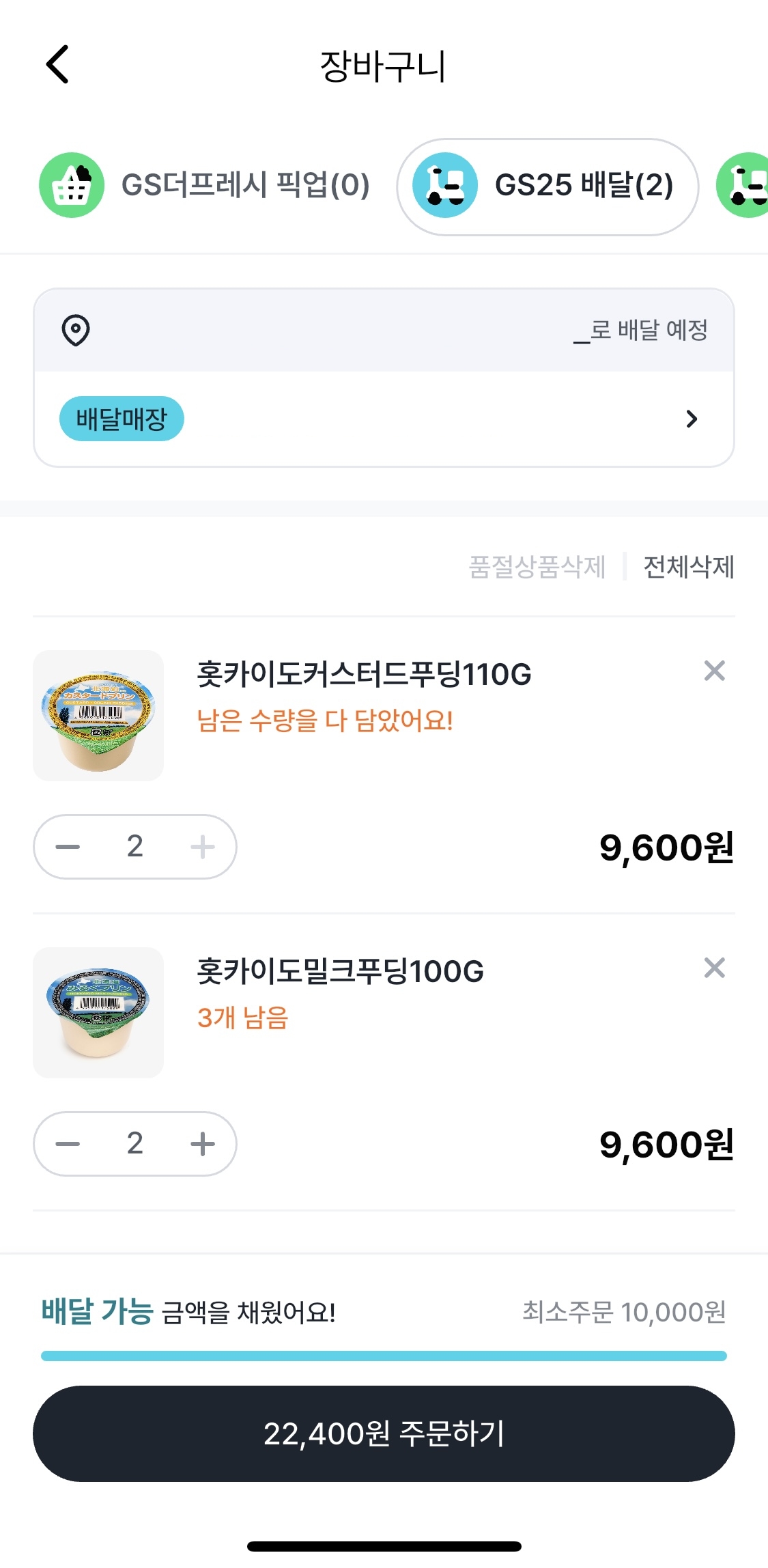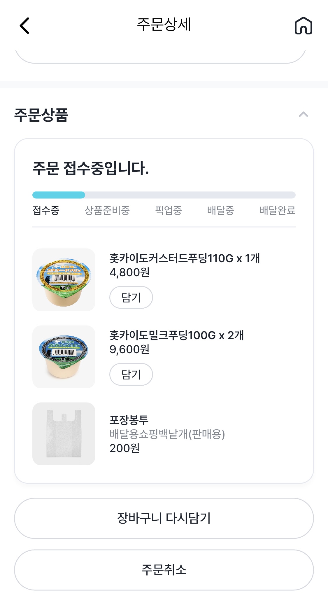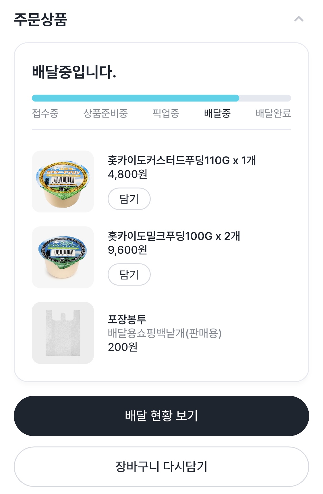 매장 상황에 따라 배달이 안 되는 곳도 있고 편의점 현장 재고가 실시간으로 달라져있어서 주문이 안될 수도 있다. 난 푸딩 총 3개를 주문했고 포장봉투 200원도 추가했다. 나중에 받아보니까 봉투에 담아서 오긴 했는데.. 만약 포장봉투를 추가하지 않으면 그냥 상품들 봉투에 안 담고 놓고 가려나..?