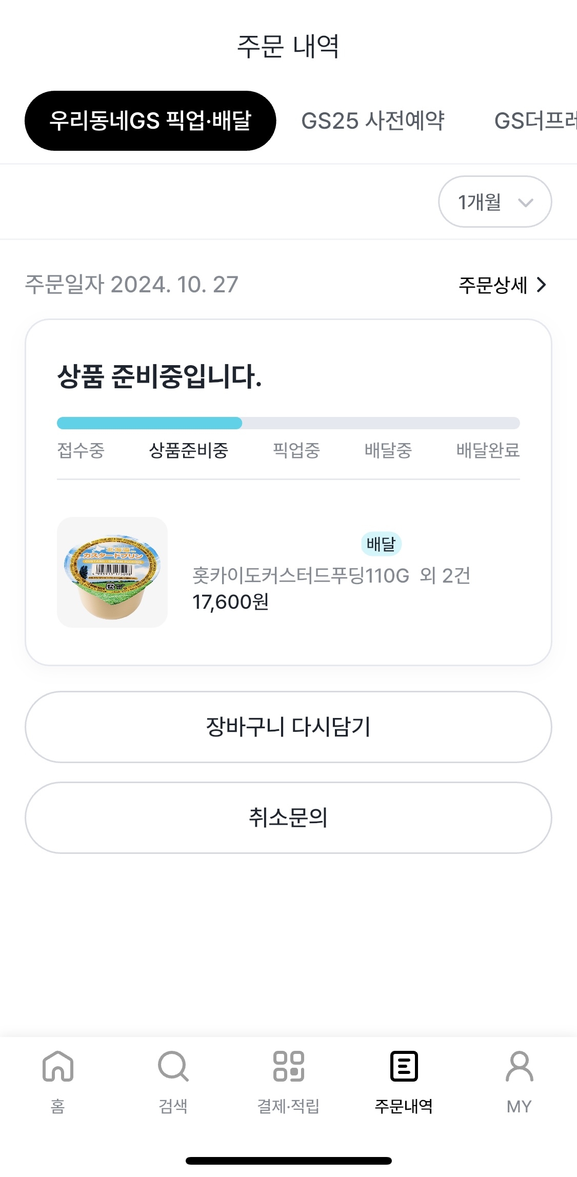 근처 편의점 재고를 자동으로 파악해 주고 알맞은 매장을 선별해 주는데, 픽업은 귀찮아서 한번 배달을 시키기로 했다. 배달 앱처럼 똑같이 상품을 장바구니에 담고 배달을 하면 된다.