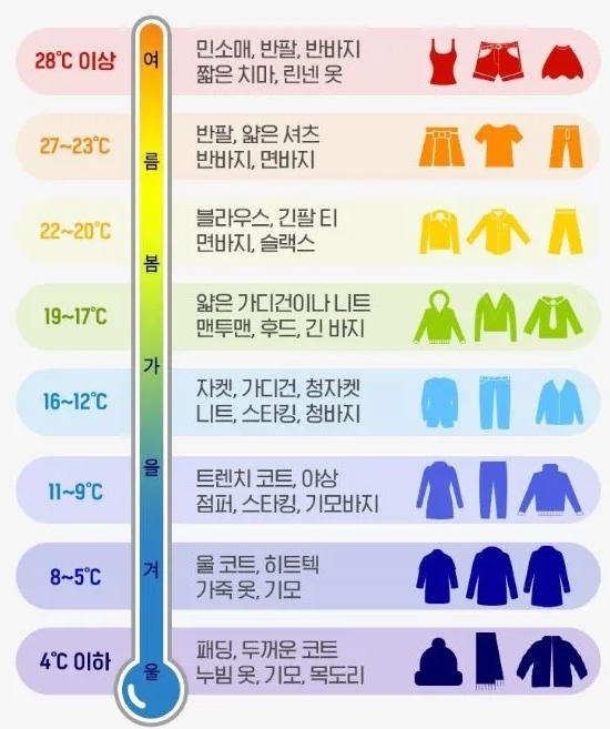 낮기온 9~16도 일 때 아침저녁 기온이 이제 낮평균 기온이 됐다면 추워졌다는 것. 이때부터는 코트를 입어도 충분한 날씨고 추위를 많이 탄다면 히트텍 같은 내의를 입기도 한다.
