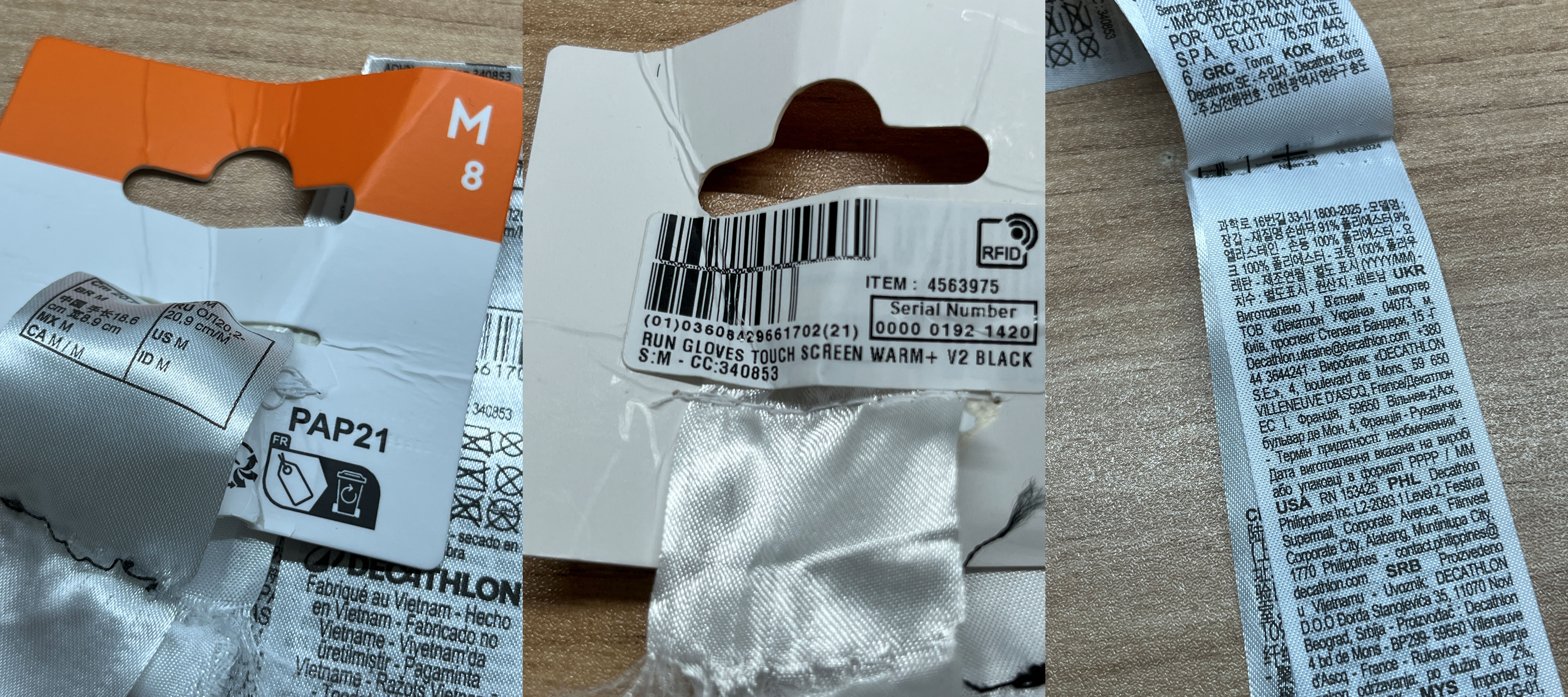 나는 M사이즈를 구매했고, 새 상품은 장갑이 택이랑 같이 아예 봉제돼 있어서 이걸 가위로 잘라내거나 등 뜯어줘야 한다. 택에 말이 많은 건 수출 국가가 많아서 그렇다.
